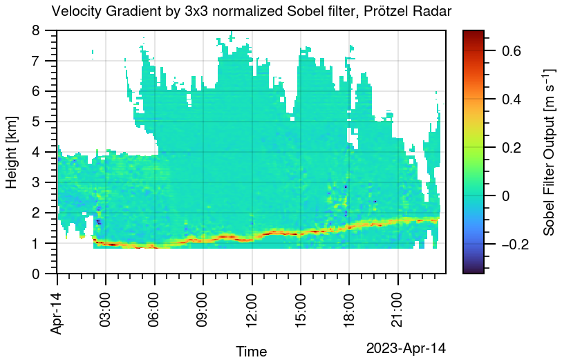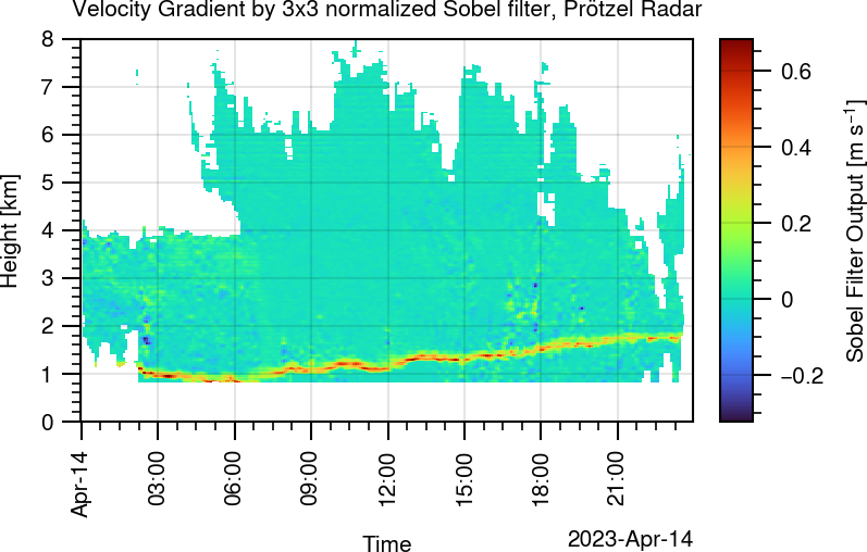 Figure B1 shows the velocity gradient resulting from the application of a normalized 3×3 Sobel filter to the Doppler velocity of the C-band birdbath scan.