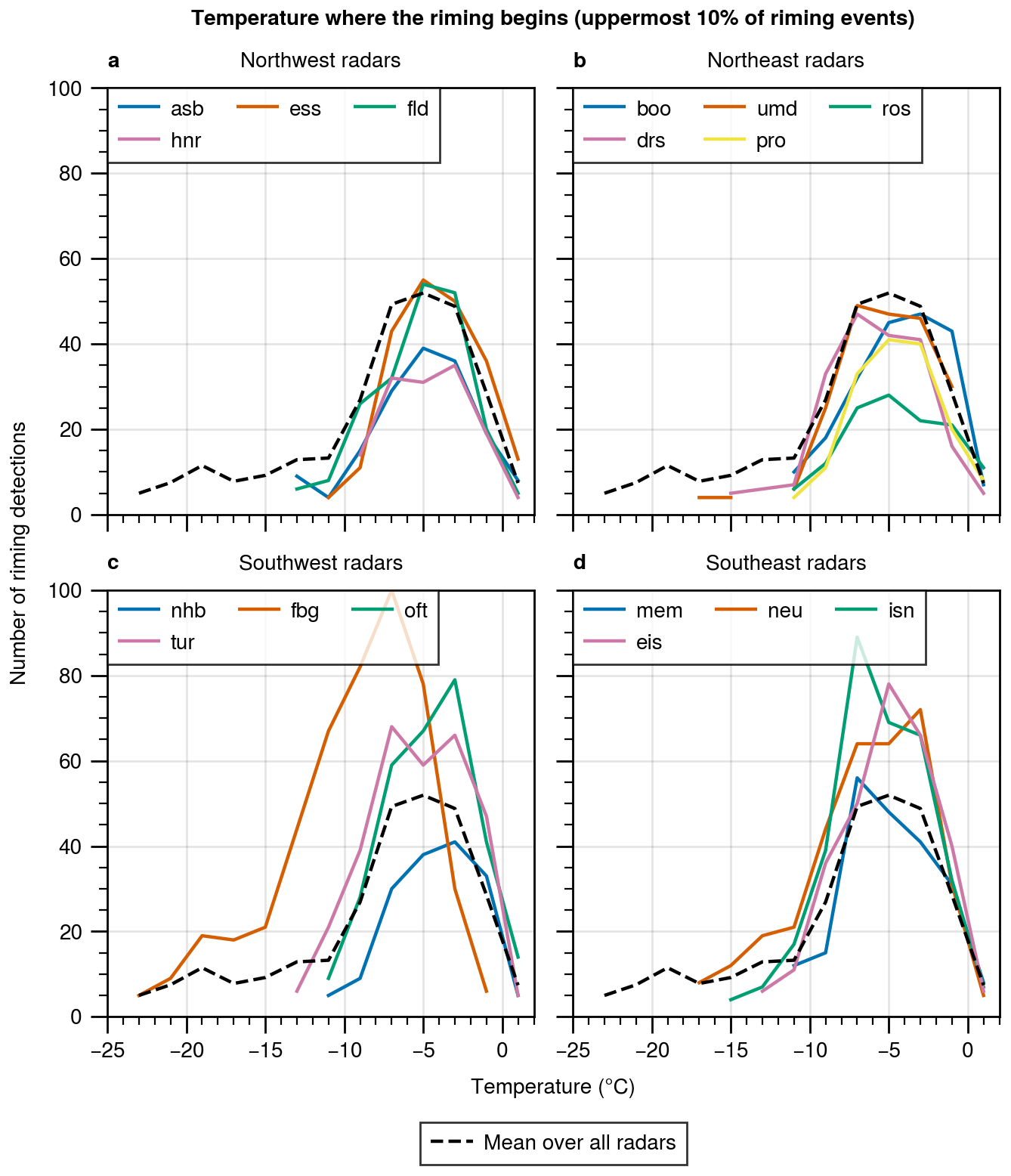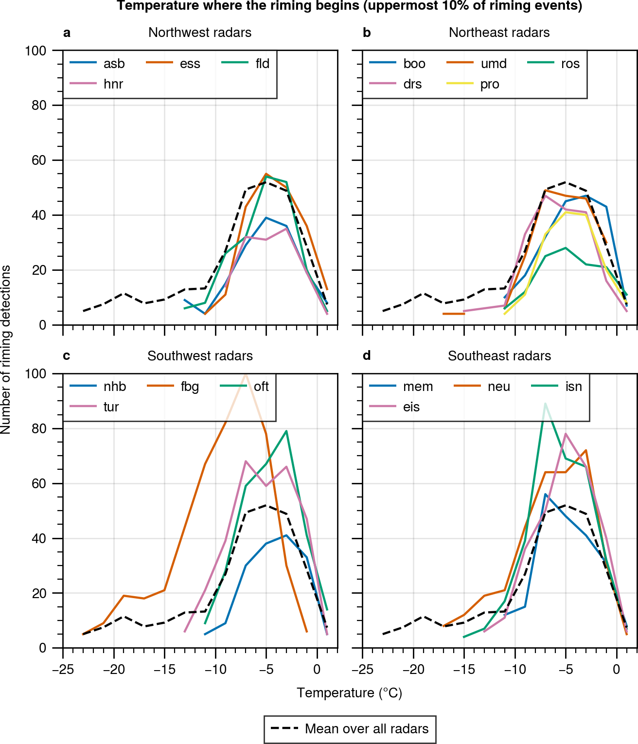 2. Differences in radar elevation: Radars located at higher elevations detect less riming at warmer temperatures than radars at lower elevations, since higher elevation radars can only observe the upper part of the atmosphere.