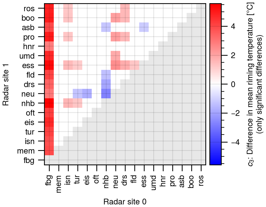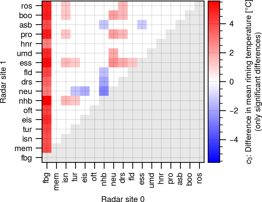Figure C2Difference in the average riming onset temperature. Shown are only significant differences with a significance level of better than 0.01. Red colors mean that radar 1 has a higher mean than radar 0.