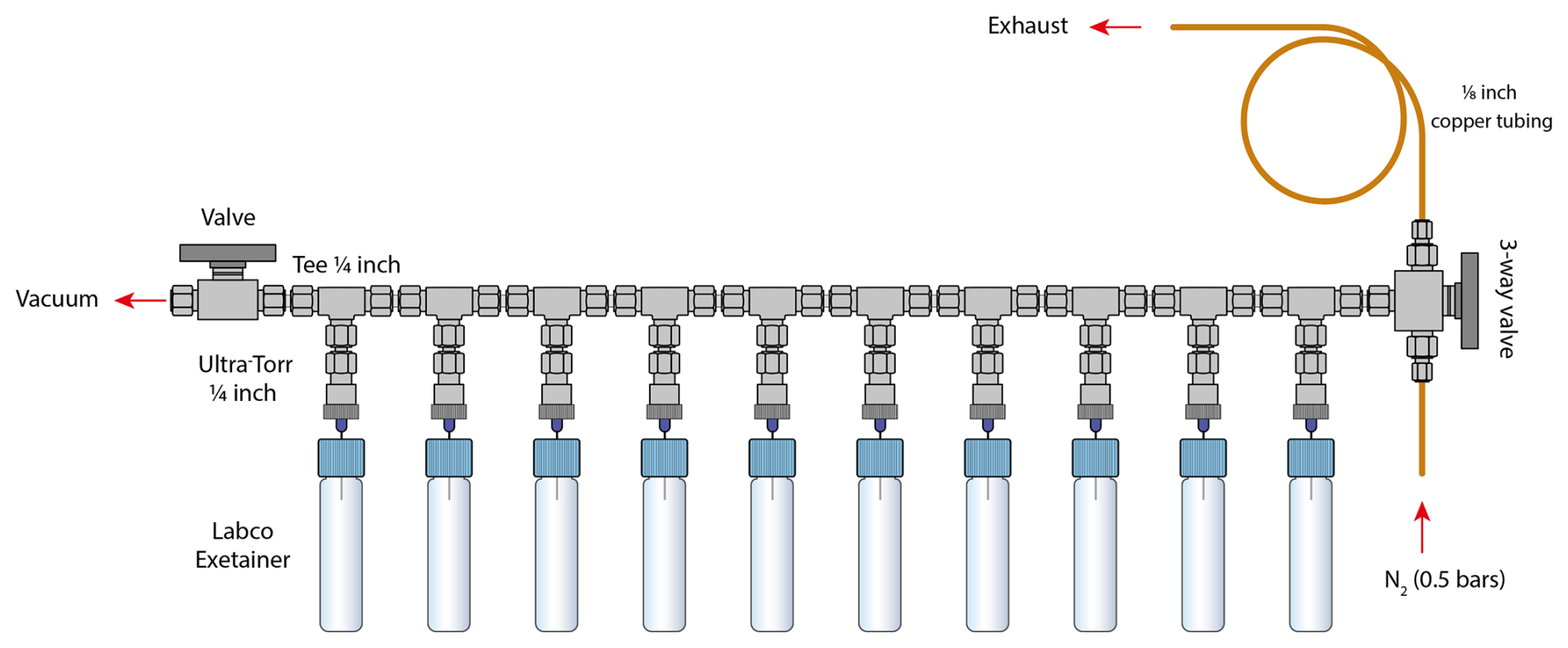 Figure 1Schematic of the vial conditioning manifold. For clarity only 10 vials positions are shown. The conditioning procedure includes: (1) vacuum of the vials to 0.02 mbar ( 8 min; two-way valve open, three-way valve closed), (2) filling with N2 gas at 0.5 bars with overpressure ( 20 s; two-way valve closed, three-way valve open to the bottom), and (3) restoration to atmospheric pressure ( 5 s; two-way valve closed, three-way valve open to the top). A 1/8-inch copper tube is connected to the exhaust outlet to minimise ambient CO2 from diffusing into the vials during pressure equilibration. Steps 1, 2 and 3 were repeated four times.