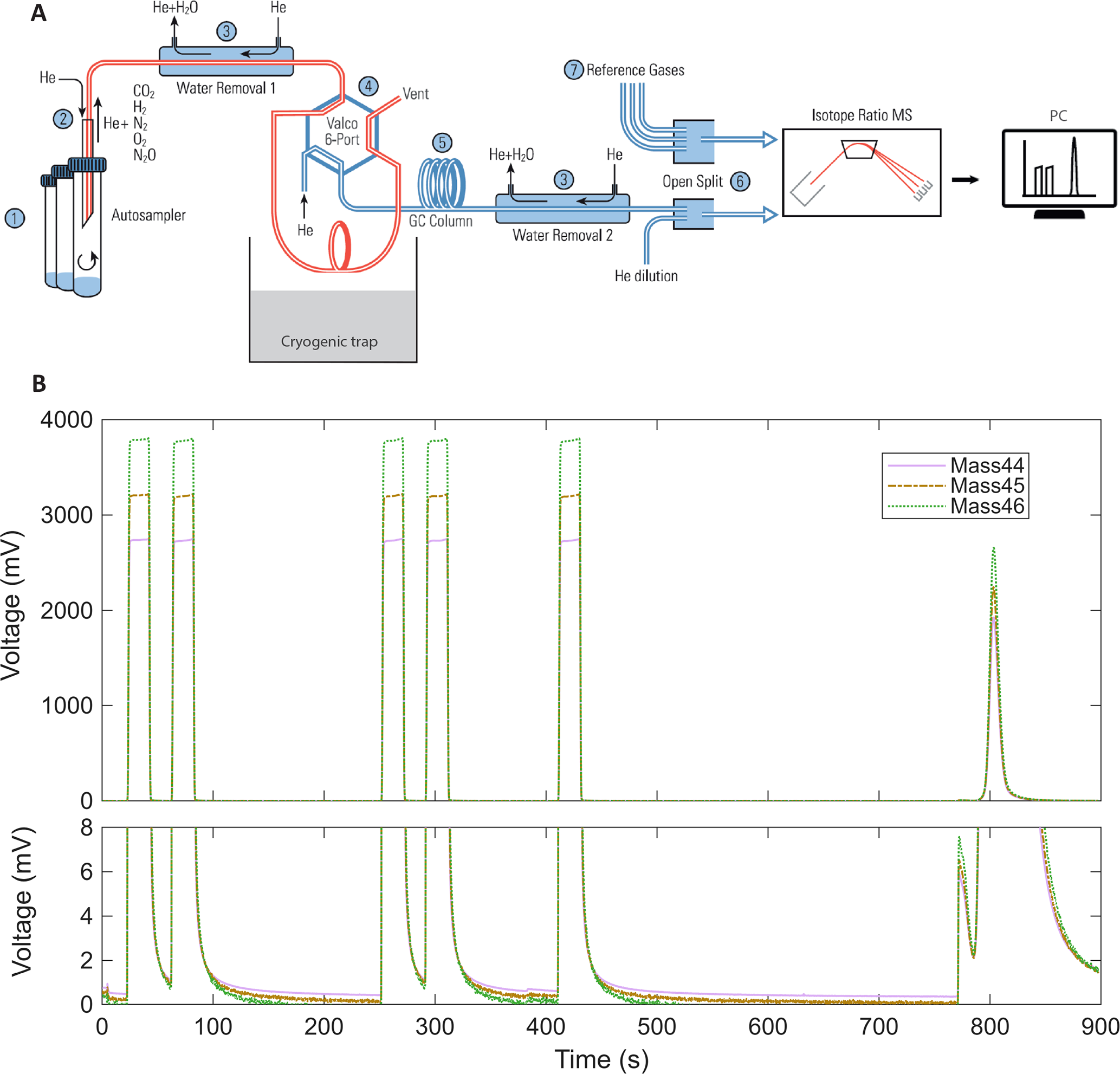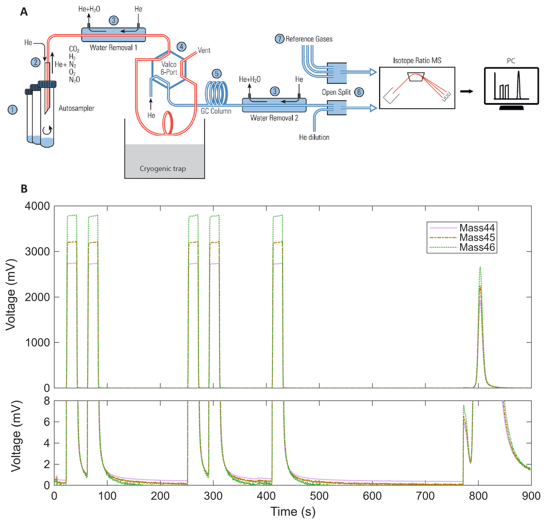 Figure 2(A) Schematic diagram of the analytical setup for δ13C-CO2 measurements adapted from Gas Bench II operating manual (Thermo Fisher Scientific, 2018) (1) sample vials loaded in the autosampler of the GasBench II; (2) injection of sample air into the helium carrier stream; (3) water-removal traps inside the GasBench; (4) 6-port Valco valve connected to the cryogenic trap; (5) separation on the GC column; (6) transfer to the ConFlo IV interface via an open-split with helium dilution; (7) introduction of reference gases through the ConFlo IV before isotope analysis by IRMS Delta V Plus. (B) Representative chromatogram obtained from the analysis of 1 mL of atmospheric air. Ion intensities for m/z 44 (purple solid line), 45 (brown dot dash line), and 46 (green dotted line), corresponding to the different isotopologues of carbon dioxide are shown. The peaks observed between 0 and 450 s correspond to successive injections of a CO2 reference gas. The main peak around 800 s corresponds to the atmospheric air sample. A zoom of the baseline (lower panel) highlights signal stability and flat baseline conditions between injections, demonstrating chromatographic separation and measurement stability. The small peak observed shortly before 800 s likely corresponds to trace contaminants or residual gases eluting prior to CO2, which is sufficiently separated and won't impact the sample analysis.
