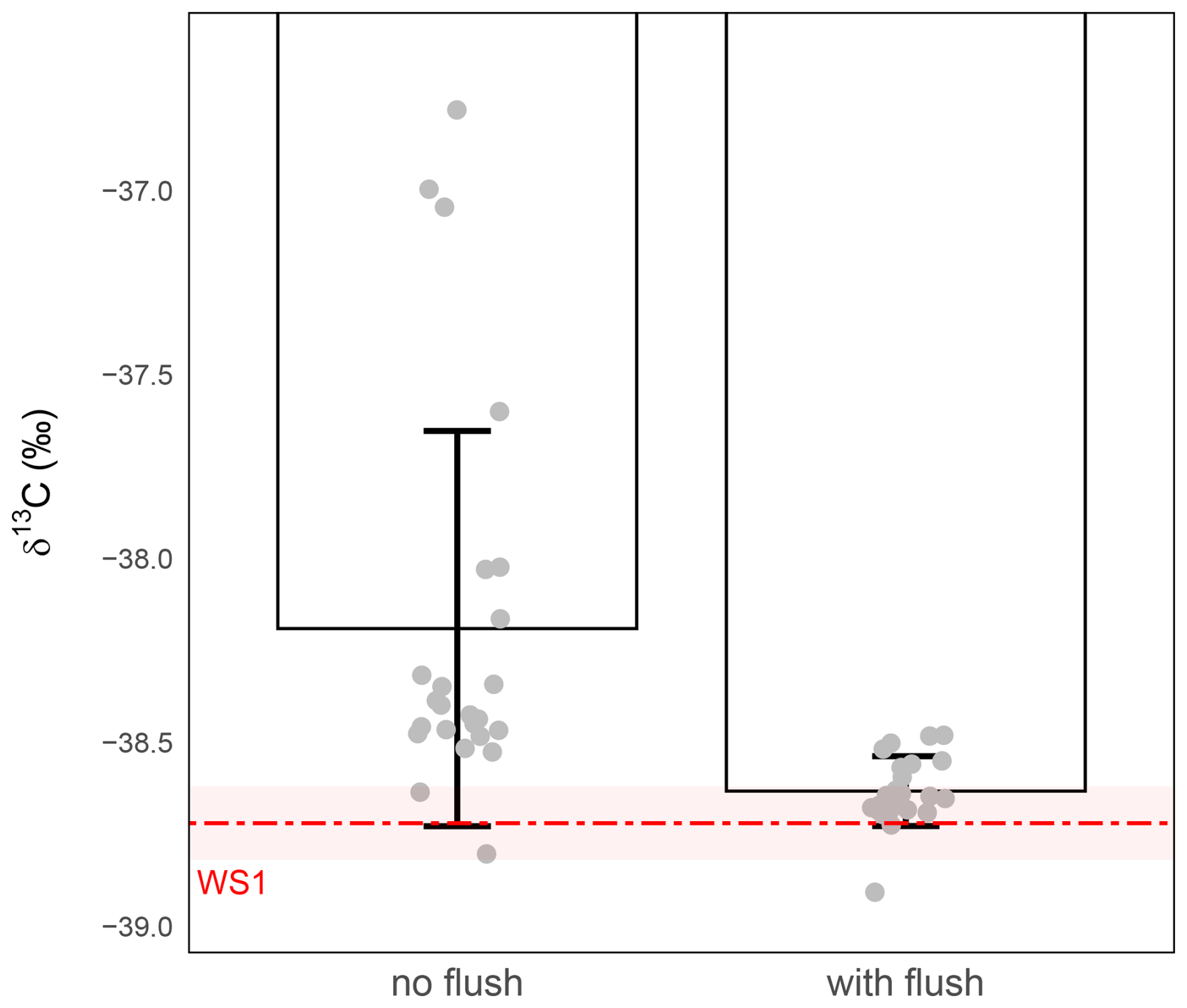 A Welch's t-test comparing the means of the flushed versus non-flushed samples confirmed that the flushing step significantly improved precision (P-value =0.00056). One-sample t-tests against the nominal WS1 δ13C-CO2 value further showed that only the flushed samples were not statistically different with the standard, demonstrating that the flushing step is essential for achieving both high precision and accurate δ13C-CO2 measurements.