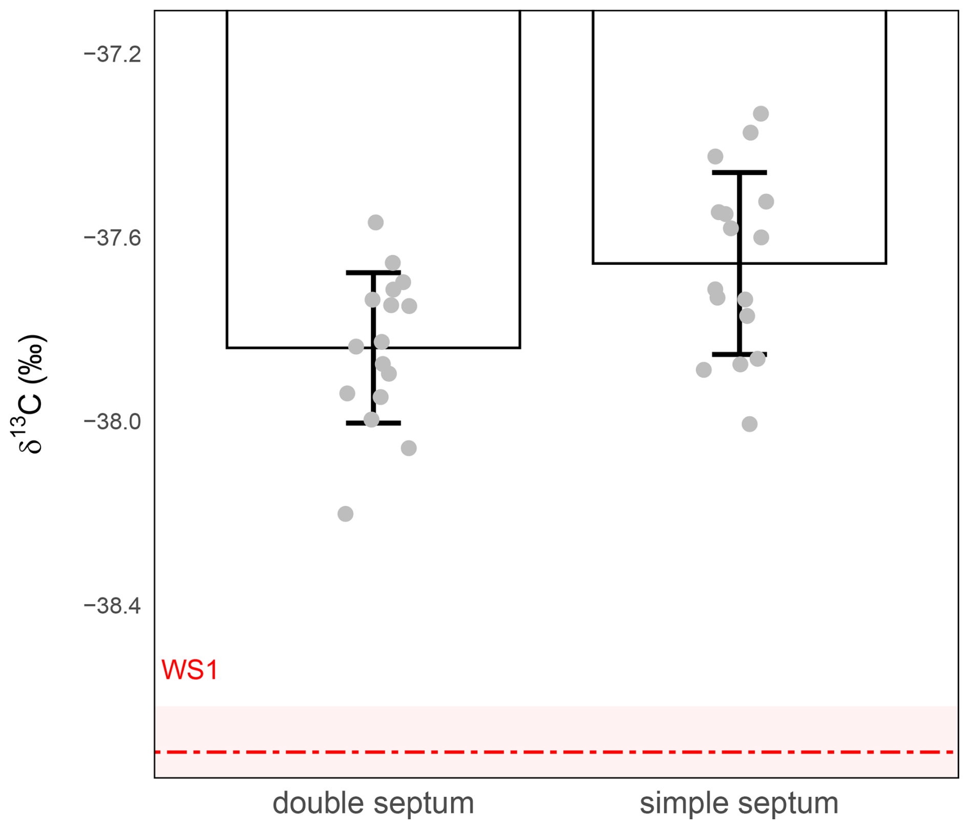 Figure 4Effect of septum configuration on δ13C-CO2 stability during 24 h storage at ambient temperature. δ13C-CO2 values (‰) were measured from 1 mL WS1 in vials sealed with either a single septum (right) or a double septum (left). The red dashed line represents the expected isotopic value of WS1 and the shaded red band the measurement precision of WS1 (-38.72±0.10). Grey circles represent individual replicate measurements. Bars show the mean ± standard deviation for each condition. Precision was ±0.16 ‰ for the double septum (n=16) and ±0.20 ‰ for the simple septum (n=16).