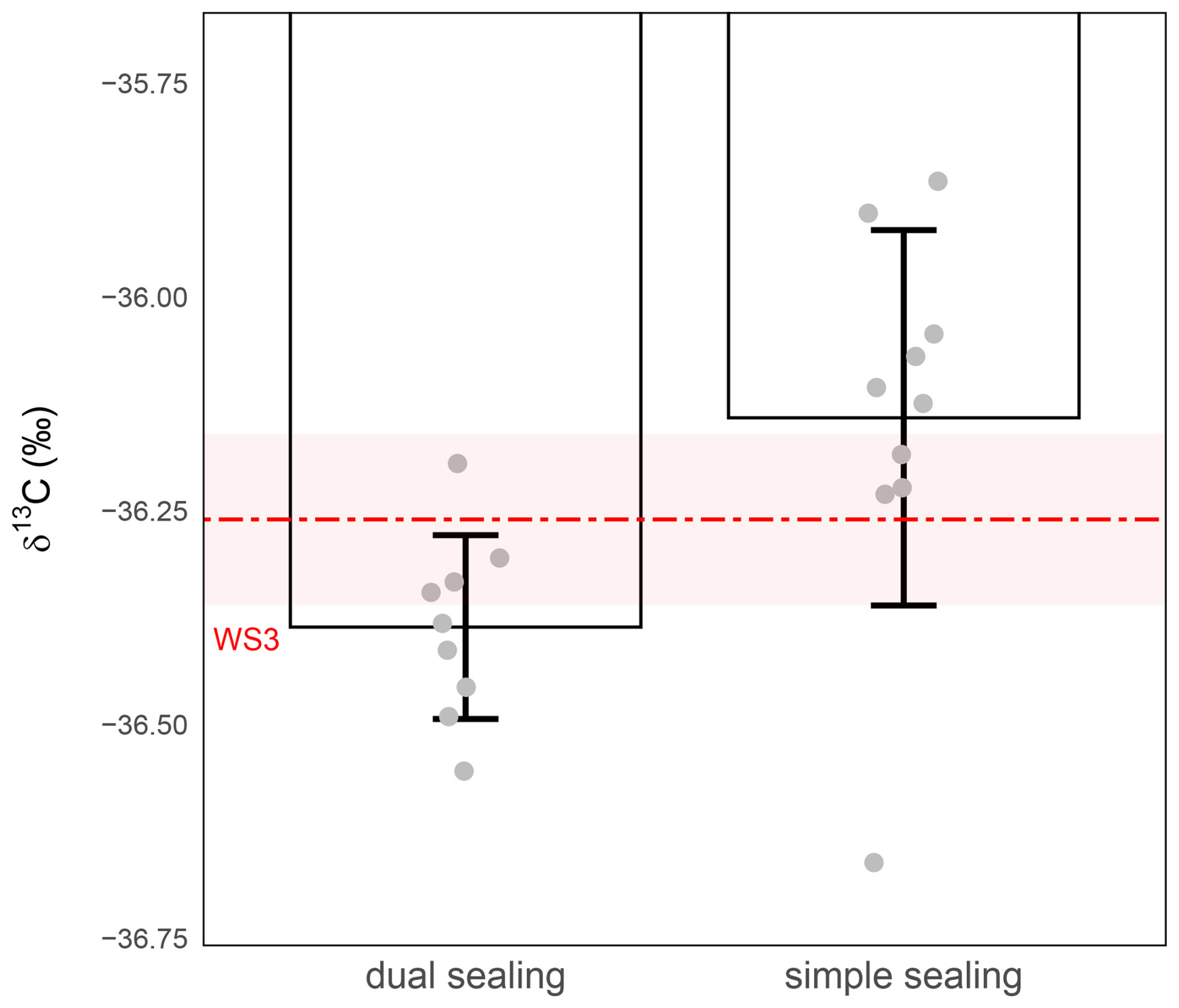 Figure 5Effect of sealing improvement on δ13C-CO2 stability during 24 h storage at ambient temperature. δ13C-CO2 values (‰) were measured from 1 mL WS3 in vials with simple- (right) or dual-sealing (left). The red dashed line represents the expected isotopic value of WS3 and the shaded red band the measurement precision of WS3 (-36.26±0.10). Grey circles represent individual replicate measurements. Bars show the mean ± standard deviation for each condition. Precision was ±0.22 ‰ with simple sealing (n=10) and ±0.11 ‰ with dual-sealing (n=9).