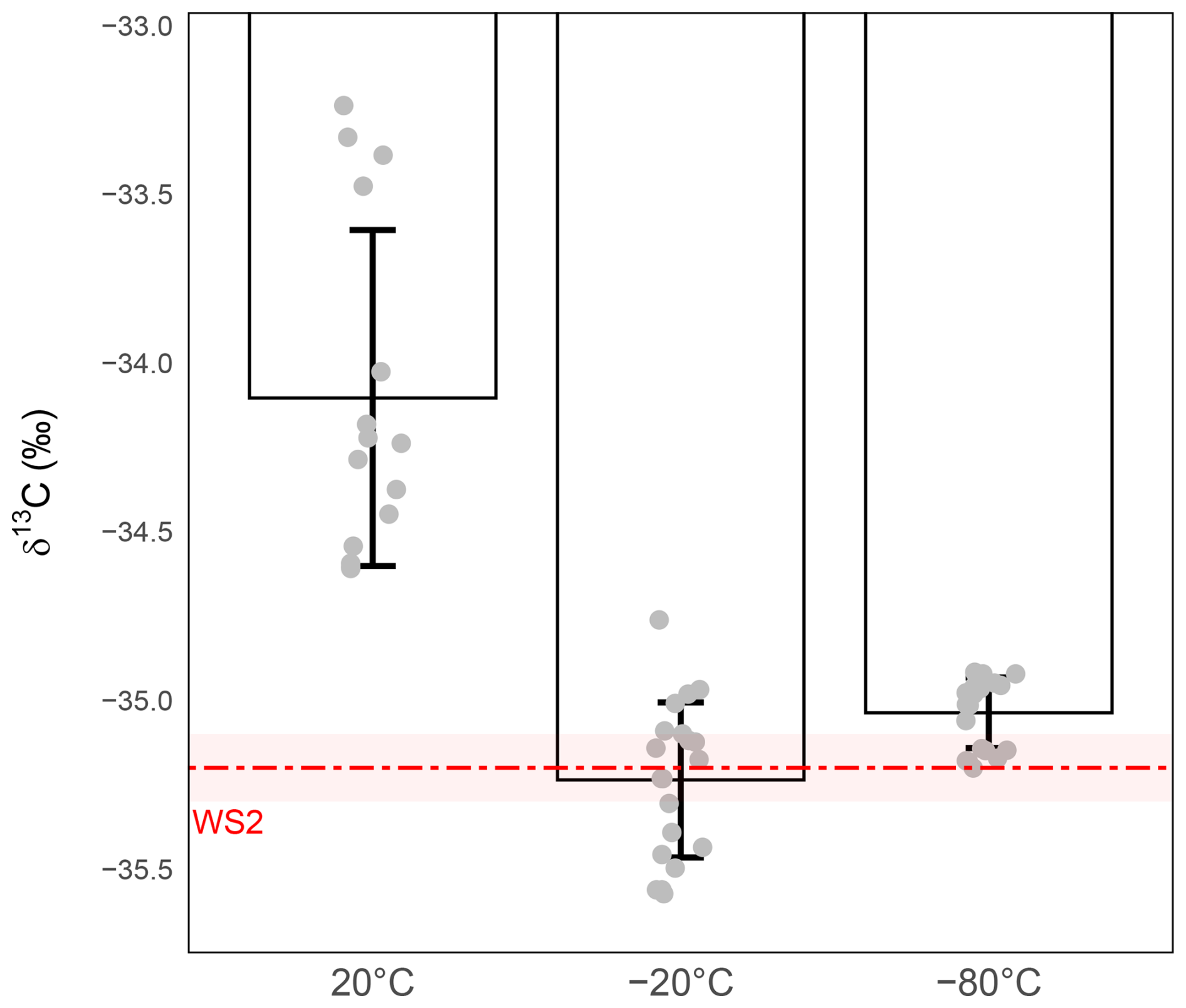 Based on this finding, a key remaining question concerns the maximum duration over which samples can be stored at −80 °C without significant isotopic drift.
