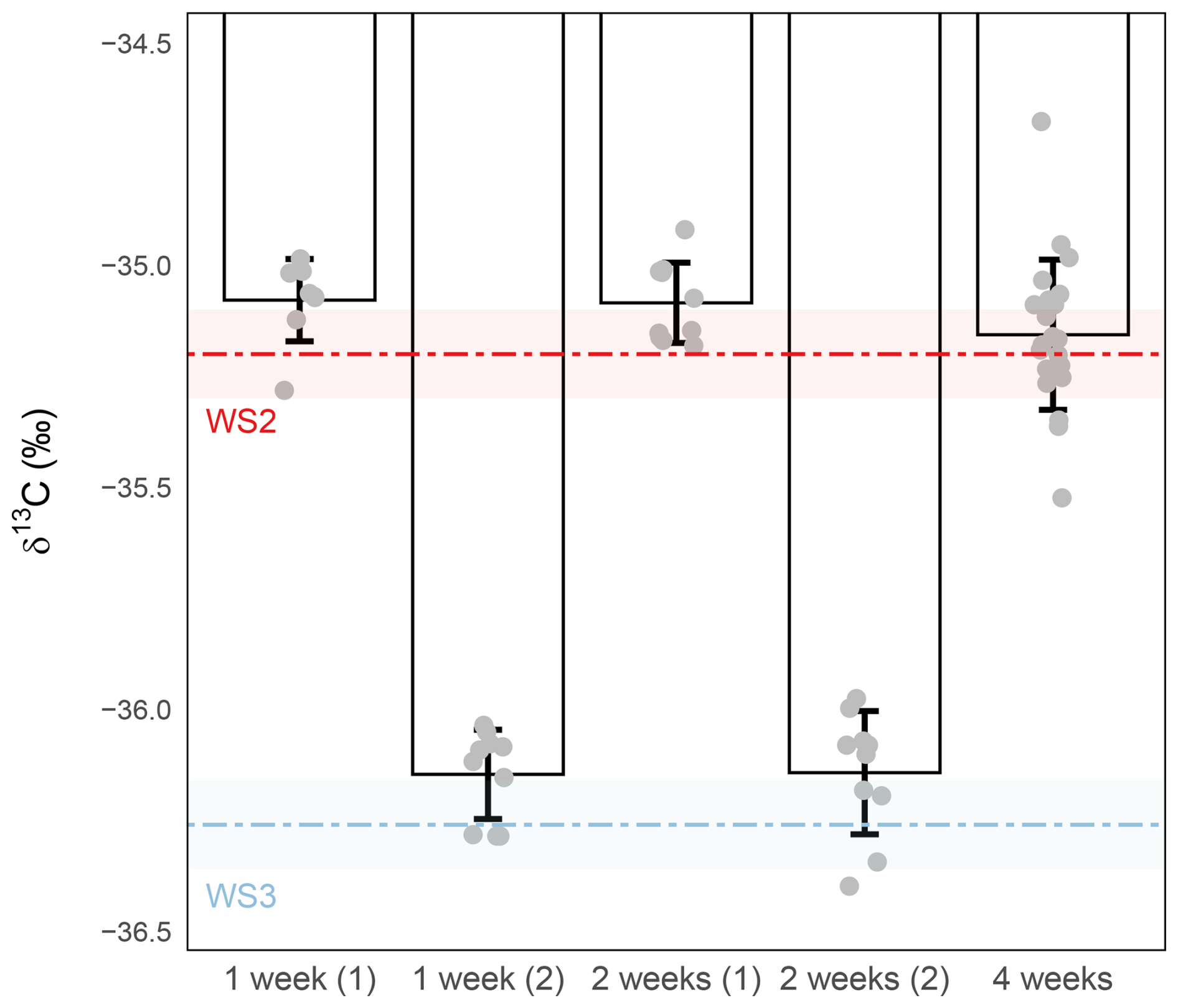 Figure 7Effect of storage duration on δ13C-CO2 stability. Sample were stored at −80 °C for 1- (left), 2- (middle) or 4-weeks (right). δ13C-CO2 values (‰) were measured from 1 mL of WS2 or WS3. The red and light blue dashed lines represent the expected isotopic value of the working standards and the shaded red and blue bands their measurement precision (-35.20±0.10 and -36.26±0.10, respectively). Grey circles represent individual replicate measurements. Bars show the mean ± standard deviation for each condition. Precision was ±0.10 ‰ (n=8) and ±0.09 ‰ (n=10) for sample stored for 1-week (sub samples (1) and (2) , respectively), ±0.13 ‰ (n=10) and ±0.09 ‰ (n=10) for sample stored for 2-weeks (sub samples (1) and (2), respectively) and ±0.17 ‰ (n=22) for sample stored for 4-weeks.