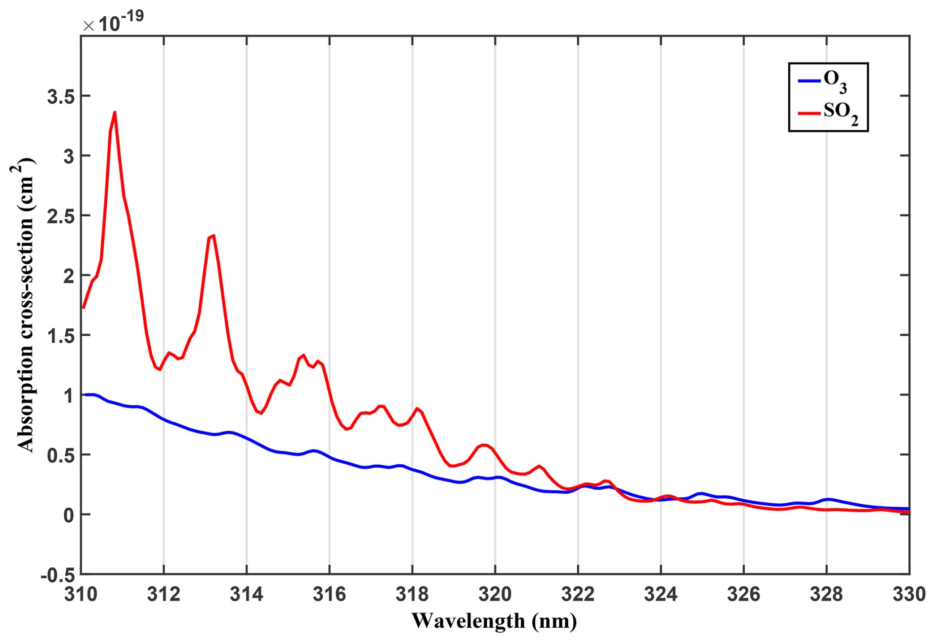 The selection of the retrieval fitting window is crucial for the accuracy of OMS SO2 retrievals, which significantly affect OMS capability in monitoring SO2 from volcanic and anthropogenic sources. A suitable fitting window helps to reduce the impact of interfering gases (O3), to enhance the SO2 information content in the satellite signal and to obtain reliable SO2 results. In this study, the 312–326 nm fitting window was selected for the OMS SO2 retrievals based on the following considerations.