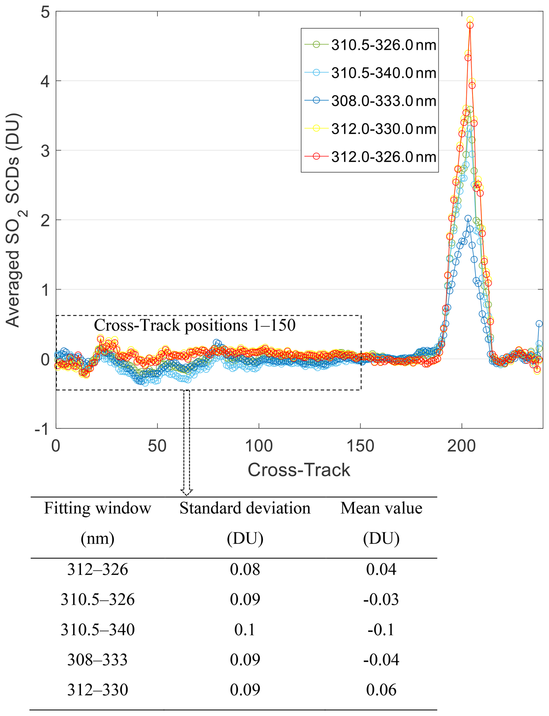 Comparisons of SO2 retrievals from different fitting windows commonly used in published studies – 312–326 nm (Theys et al., 2017), 310.5–326 nm (Theys et al., 2021), 310.5–340 nm (Li et al., 2013), 308–333 nm (Yang et al., 2009, 2013), and 312–330 nm (Nowlan et al., 2011) – over the Sundhnúkur volcano and the surrounding clean region on 23 August 2024 (Fig. 2) show that the 312–326 nm window has higher SO2 values within the volcanic plume and lower standard deviations and mean values in the clean region (cross-track positions 1–150). These results demonstrate the suitability of the 312–326 nm fitting window for OMS SO2 retrievals. The discrete wavelengths (310.8, 311.9, 313.2, and 314.4 nm) used in the Band Residual Difference (BRD) algorithm (Krotkov et al., 2006) were not considered in this study because the OMS SO2 retrieval is based on DOAS algorithm that employs a hyperspectral UV fitting window. The 300–335 nm fitting window employed in the EISF algorithm (Yang et al., 2010) was also not considered in this study because the OMS VIS band starts at 307 nm, and the OMS UV2 spectral range (300–320 nm) requires further calibration.