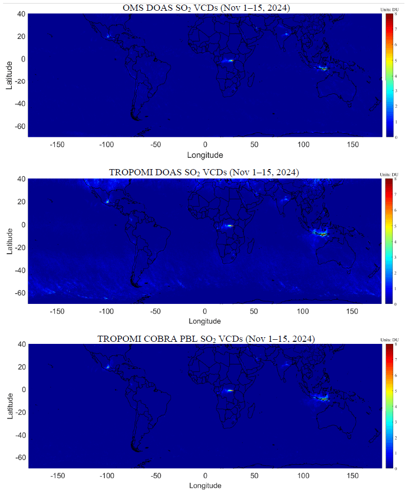 Figure 4Global maps of averaged SO2 VCDs from OMS, TROPOMI DOAS and TROPOMI COBRA for 1–15 November 2024, 0.2° × 0.2° equal latitude-longitude grid. Note that the TROPOMI DOAS SO2 VCDs are obtained from the product variable “sulfurdioxide_total_vertical_column”, and only pixels with QA > 0.5 are used.