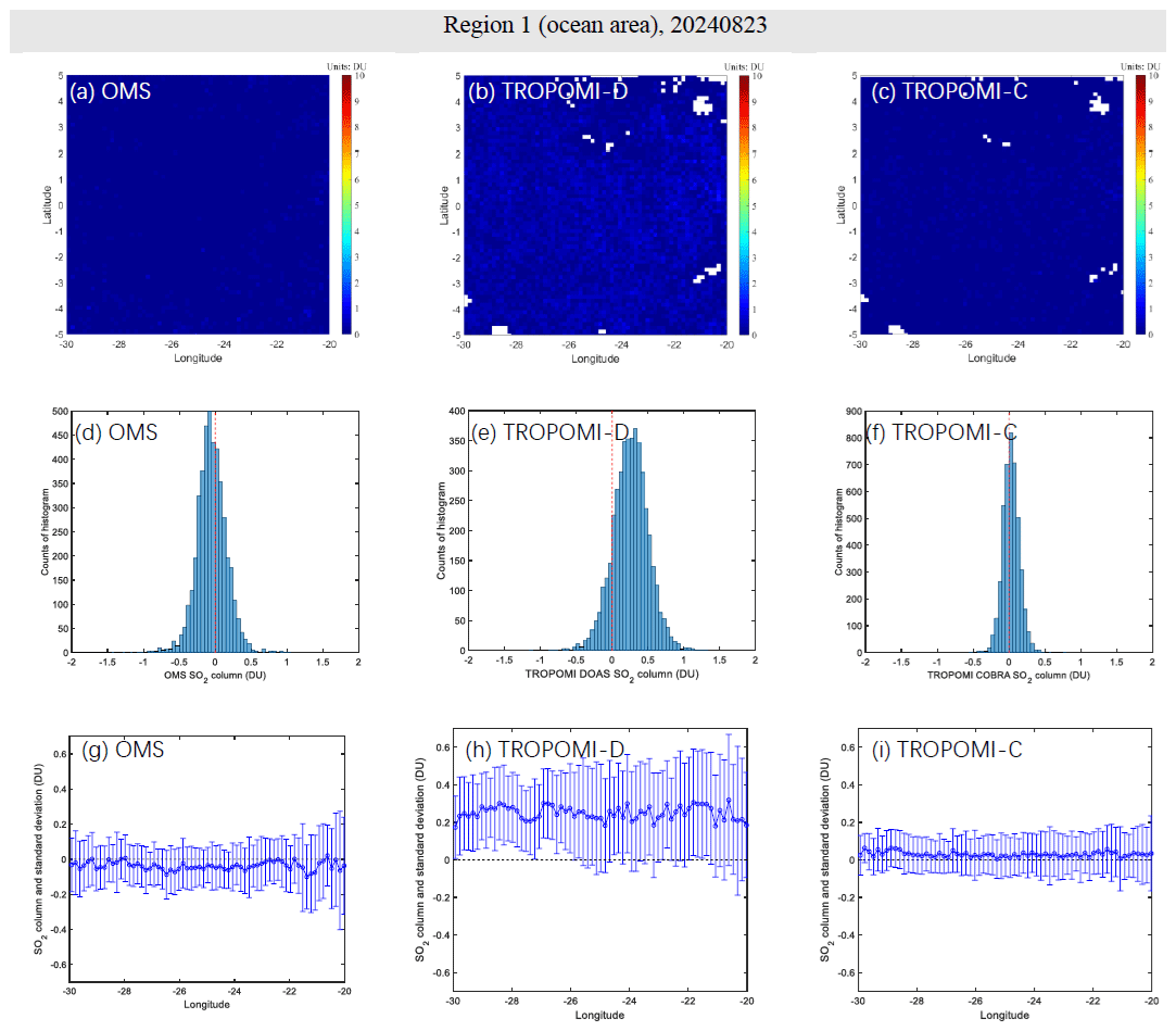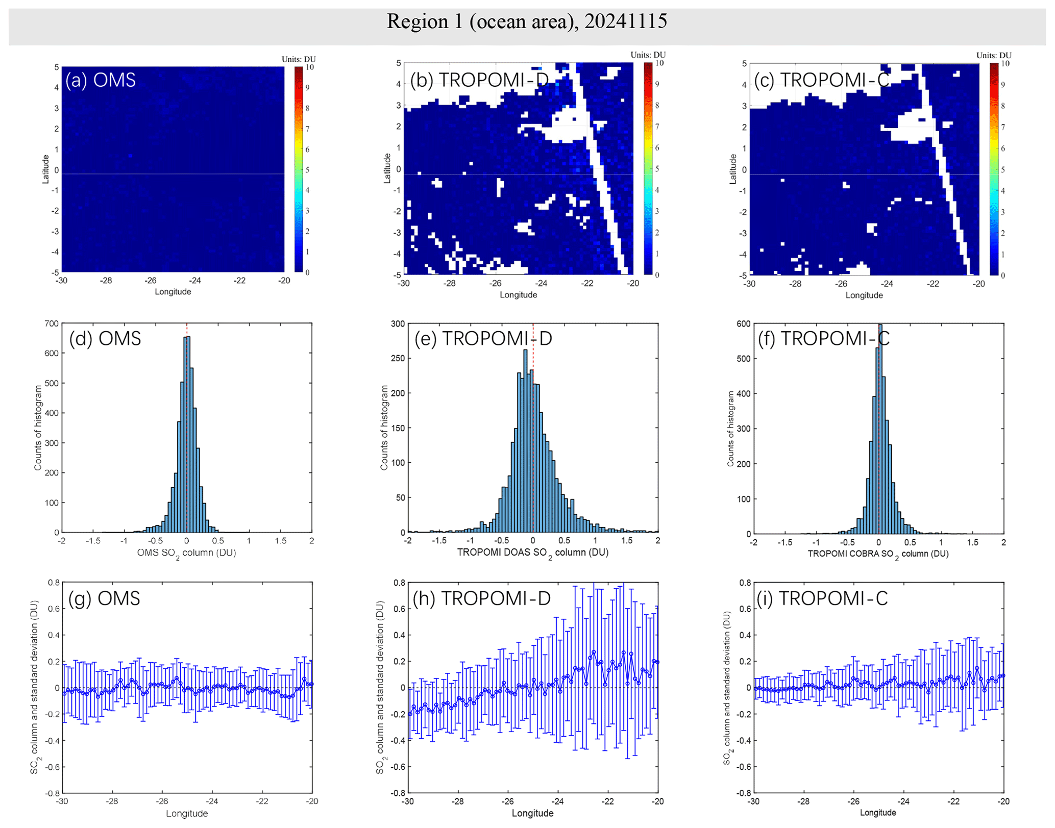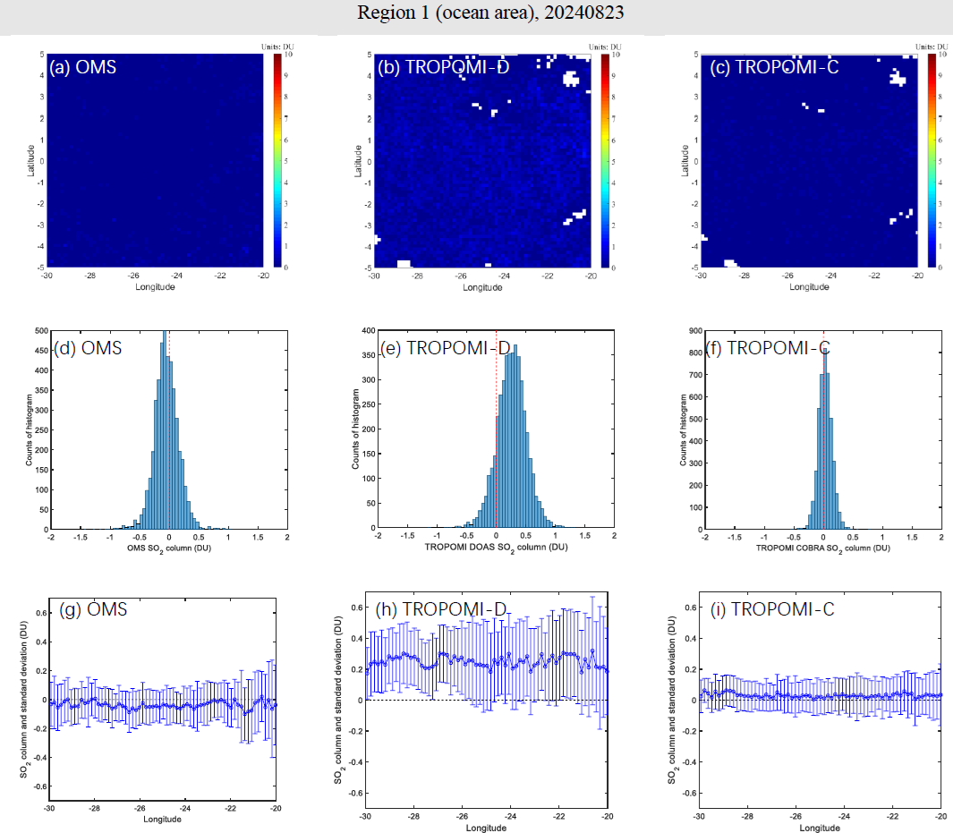 Figure 6SO2 retrievals over clean oceanic area (latitude from 5° S to 5° N and longitude from 30 to 20° W, Region 1) on 23 August 2024. (a–c) Spatial distribution of resampled FY-3F/OMS, TROPOMI DOAS (TROPOMI-D) and TROPOMI COBRA (TROPOMI-C) PBL SO2 columns over Region 1; (d–f) histogram of resampled OMS, TROPOMI DOAS and TROPOMI COBRA PBL SO2 columns over Region 1; (g–i) variation and standard deviations of the latitude-averaged SO2 columns over Region 1. Note that OMS pixels with SO2 column less than −10 DU and TROPOMI DOAS pixels with QA < 0.5 are assigned the value of −9999 and are not shown in the panels. The missing pixels in panels (b) and (c) are due to quality filtering applied to TROPOMI data.