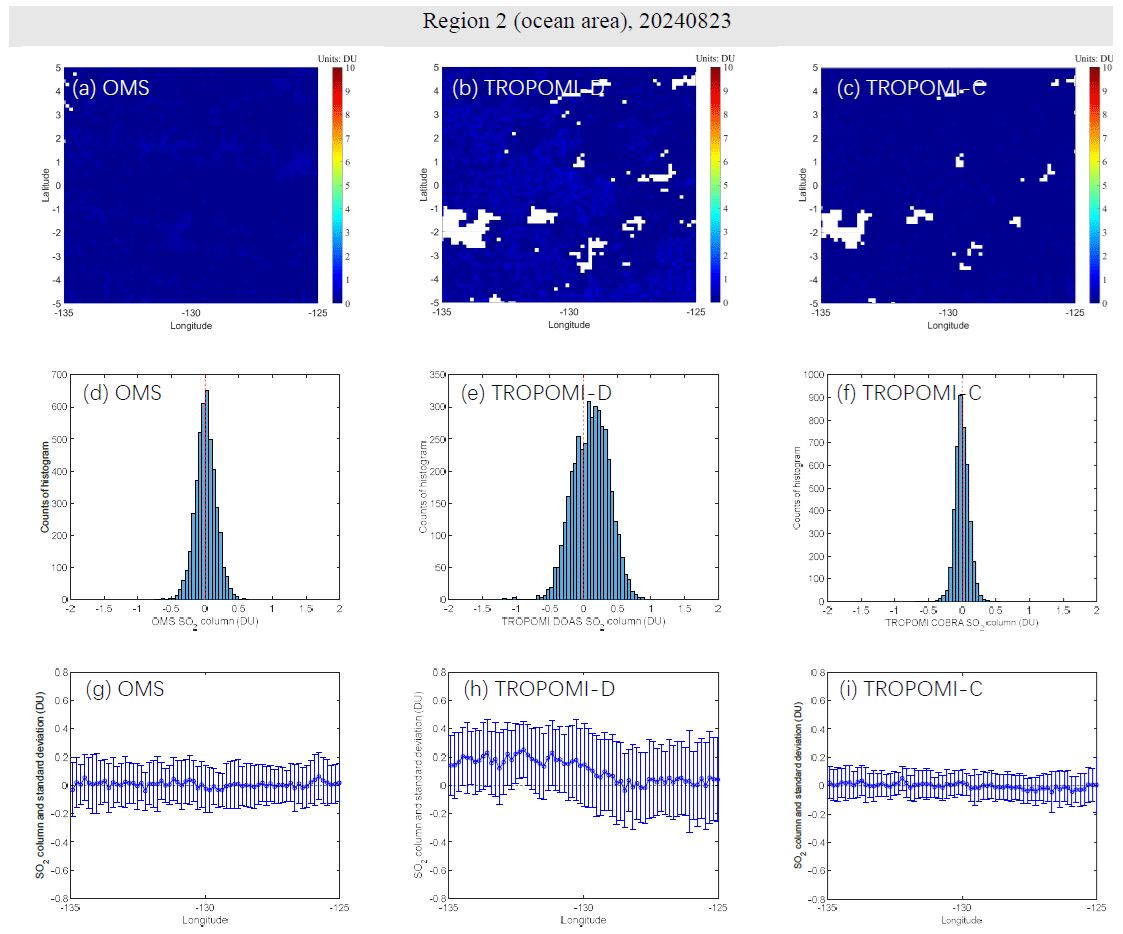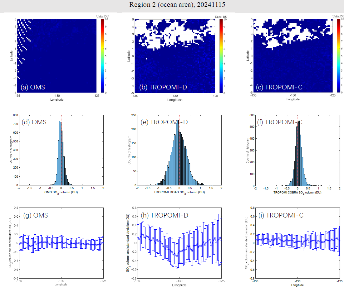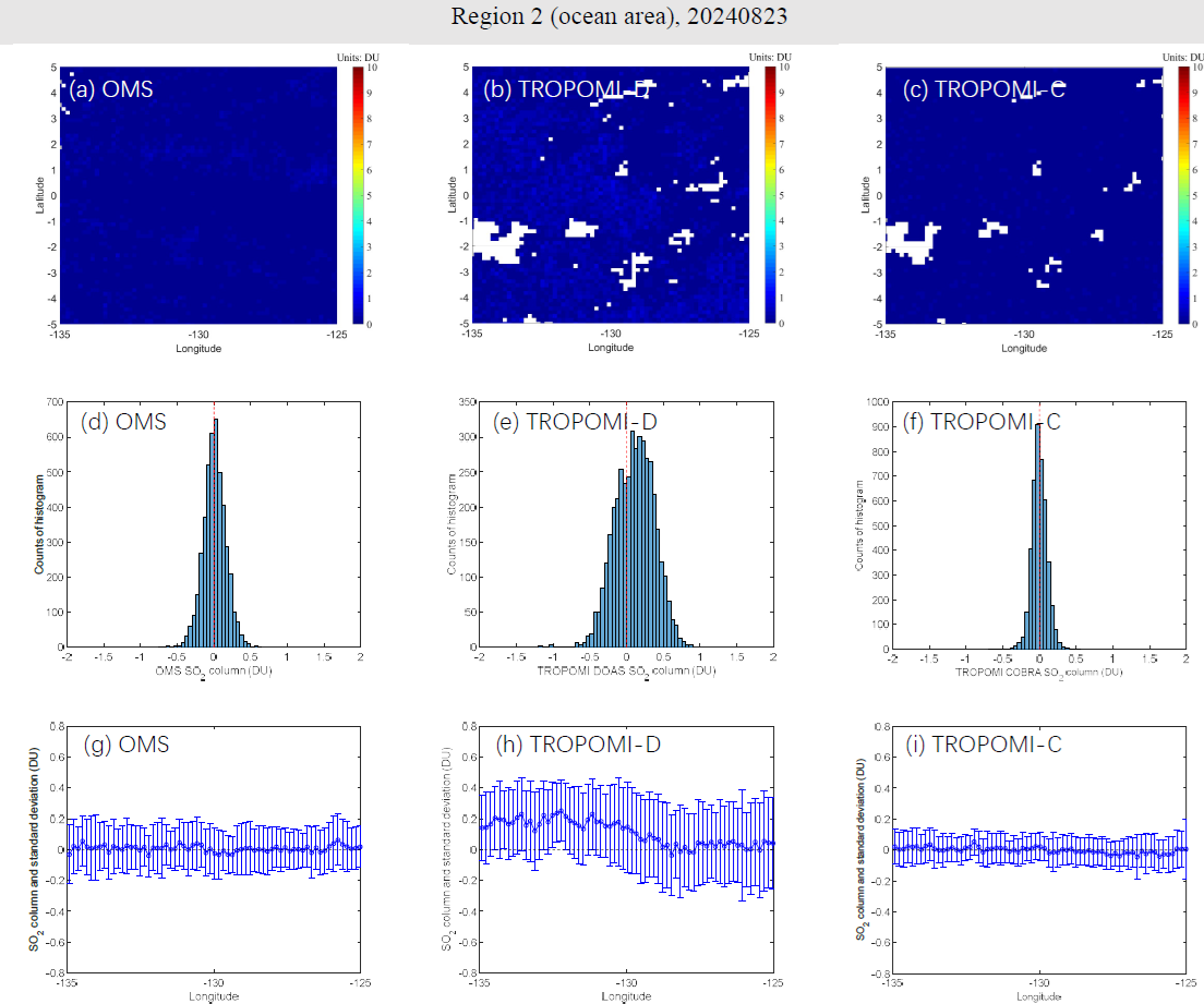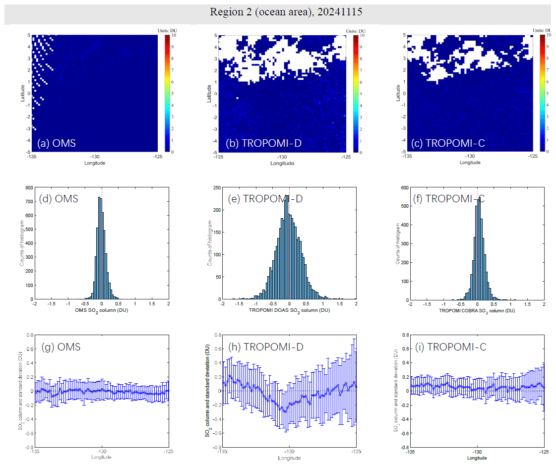 Overall, comparisons from different dates and different clean oceanic regions indicate that FY-3F/OMS SO2 retrievals have a reliable precision of approximately 0.15 DU over low-emission regions, and the data quality is relatively stable over time. It is worth noting that the retrieval errors for both OMS and TROPOMI are relatively large at the edges of the orbit, which is likely due to fewer valid pixels in these regions, resulting in larger standard deviations; thus, these pixels should be used with caution.