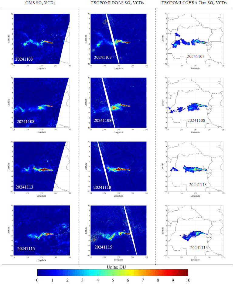 Figure 11SO2 retrievals of OMS and TROPOMI over the Nyamuragira volcano on 3, 8, 13, and 15 November 2024. From left to right, the panels show OMS SO2 VCDs, TROPOMI DOAS SO2 VCDs, and TROPOMI COBRA 7 km L3 SO2 VCDs. The missing pixels are the gap between the two orbits, or the Nan values due to quality filtering applied to TROPOMI COBRA data.