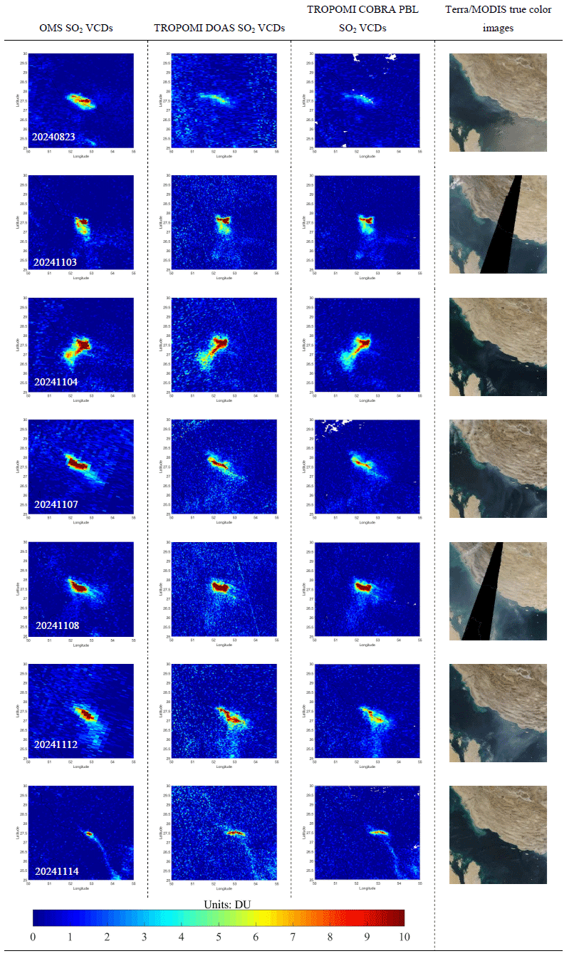 Figure 12SO2 retrievals of OMS and TROPOMI over the Persian Gulf on 23 August 2024, and 3, 4, 7, 8, 12, and 14 November 2024. From left to right, the panels show OMS SO2 VCDs, TROPOMI DOAS SO2, TROPOMI COBRA PBL L3 SO2, and Terra/MODIS true color images. Each row corresponds to the same observation date. The missing pixels are Nan values due to quality filtering applied to TROPOMI COBRA data.