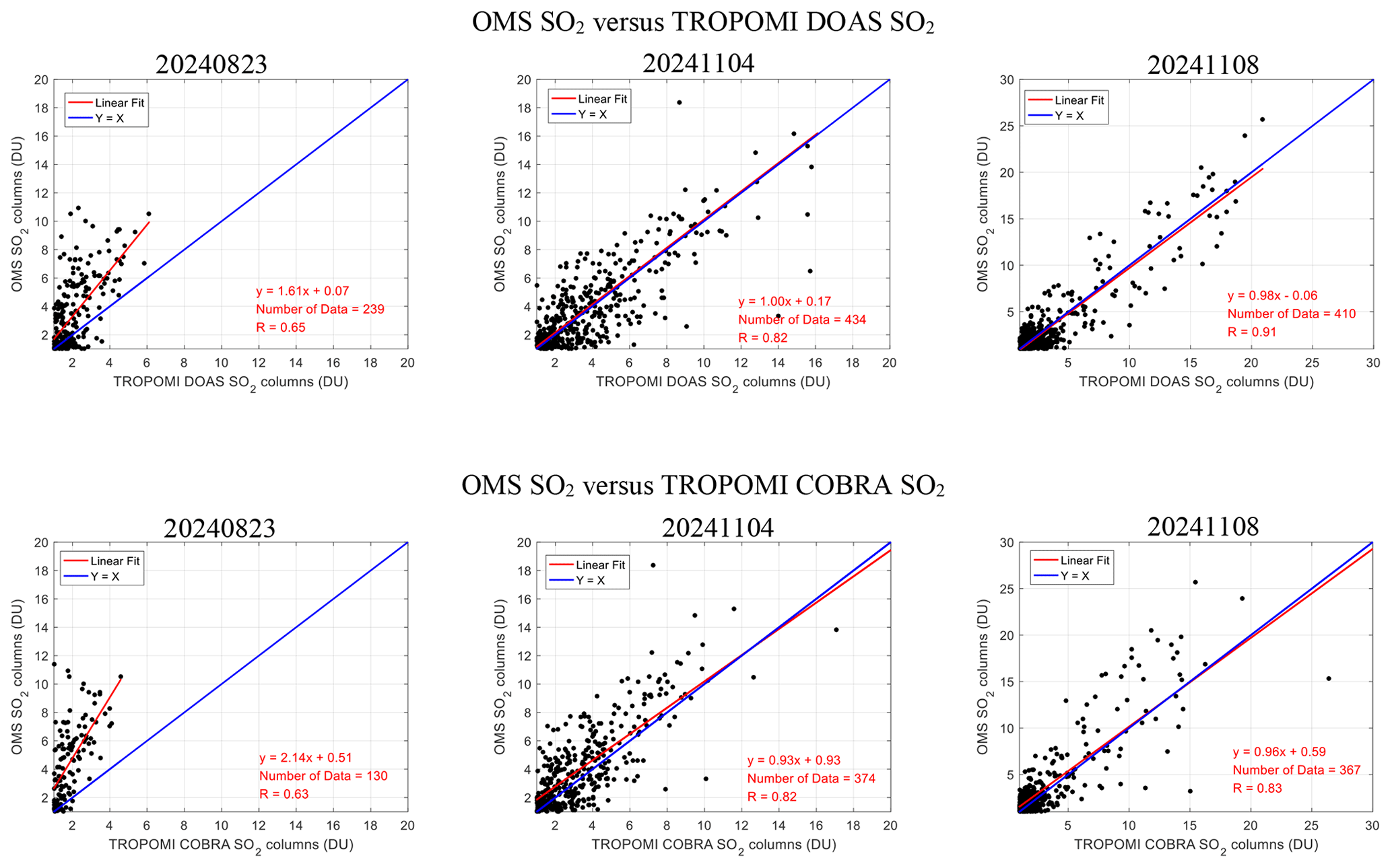In summary, the agreement between the OMS and TROPOMI measurements is within expectations, taking into account the differences in satellite overpass times and the uncertainties associated with AMF. With its high spectral and spatial resolution, morning overpass time, daily global coverage, and reliable SO2 retrieval results, OMS will provide effective data support for monitoring the continuous SO2 changes from global volcanic eruptions and anthropogenic activities, helping to fill the spatial and temporal gaps in the existing global satellite network.
