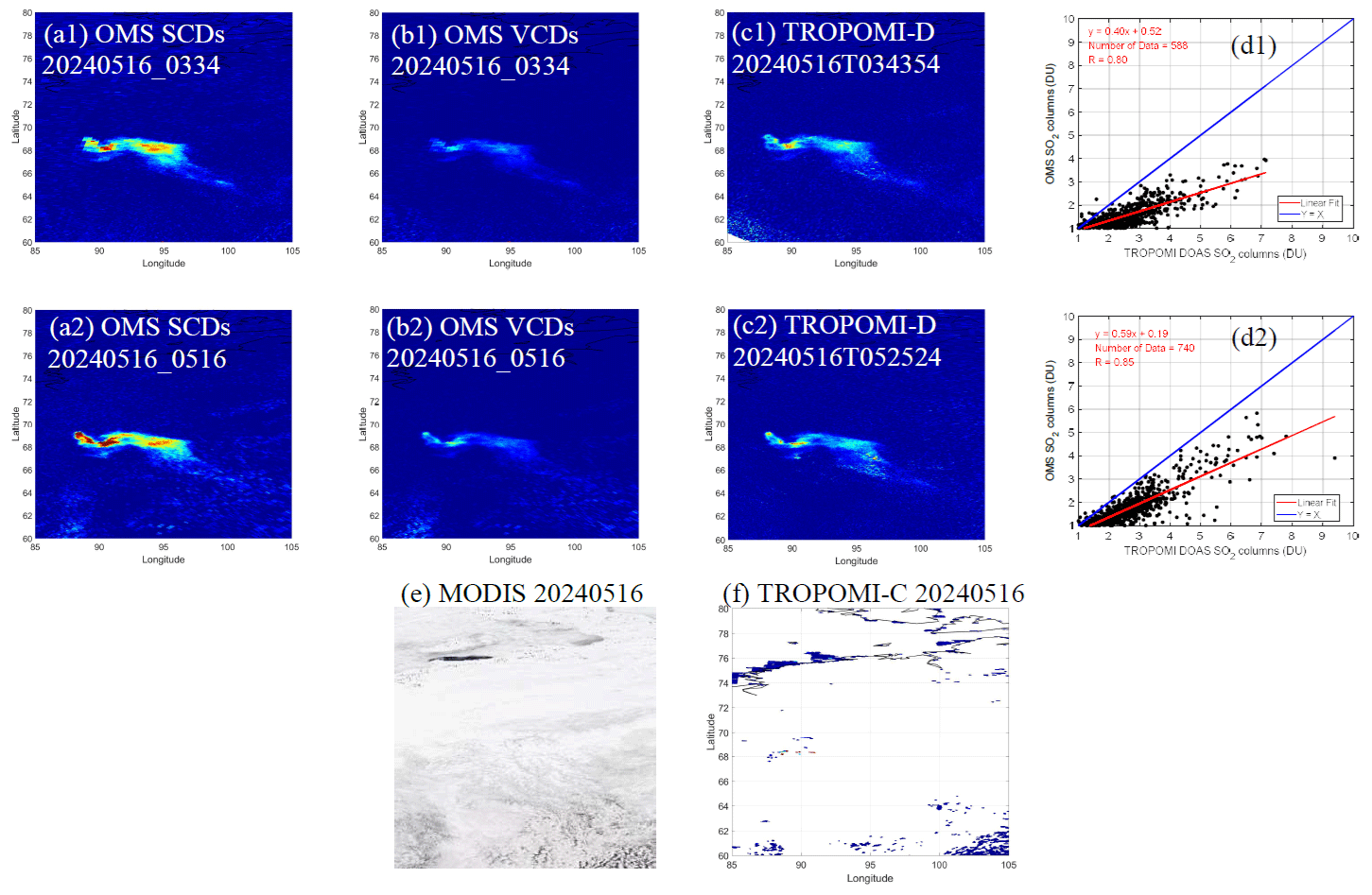 Figure 15SO2 retrievals over Norilsk on 16 May 2024. (a1–c2) Spatial distribution of FY-3F/OMS and TROPOMI DOAS SO2 columns over Norilsk; (d1–d2) scatter plots of OMS and TROPOMI DOAS SO2 columns over Norilsk on 16 May 2024, where pixels with SO2 columns greater than 1 DU were selected within 60–80° N and 85–105° E, and TROPOMI were resampled to the latitude-longitude grid of OMS; (e) true Color Image of Norilsk from Terra/MODIS on 16 May 2024; (f) SO2 columns from TROPOMI COBRA PBL over Norilsk on 16 May 2024. Note that the missing pixels in panel (f) are due to quality filtering applied to TROPOMI COBRA data.