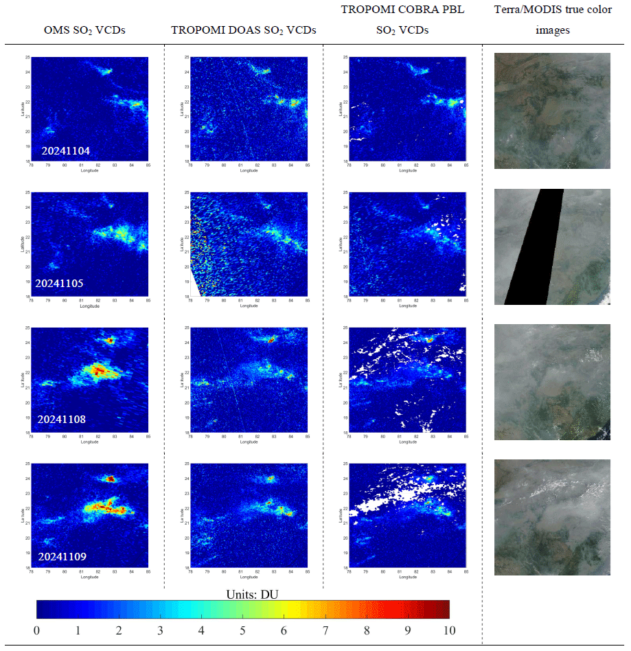 Figure 16SO2 retrievals of OMS and TROPOMI over Eastern India on 4, 5, 8, and 9 November 2024. From left to right, the panels show OMS SO2 VCDs, TROPOMI DOAS SO2, TROPOMI COBRA PBL L3 SO2, and Terra/MODIS true color images. Each row corresponds to the same observation date. The missing pixels are the gap between the two orbits, or the Nan values due to quality filtering applied to TROPOMI COBRA data.