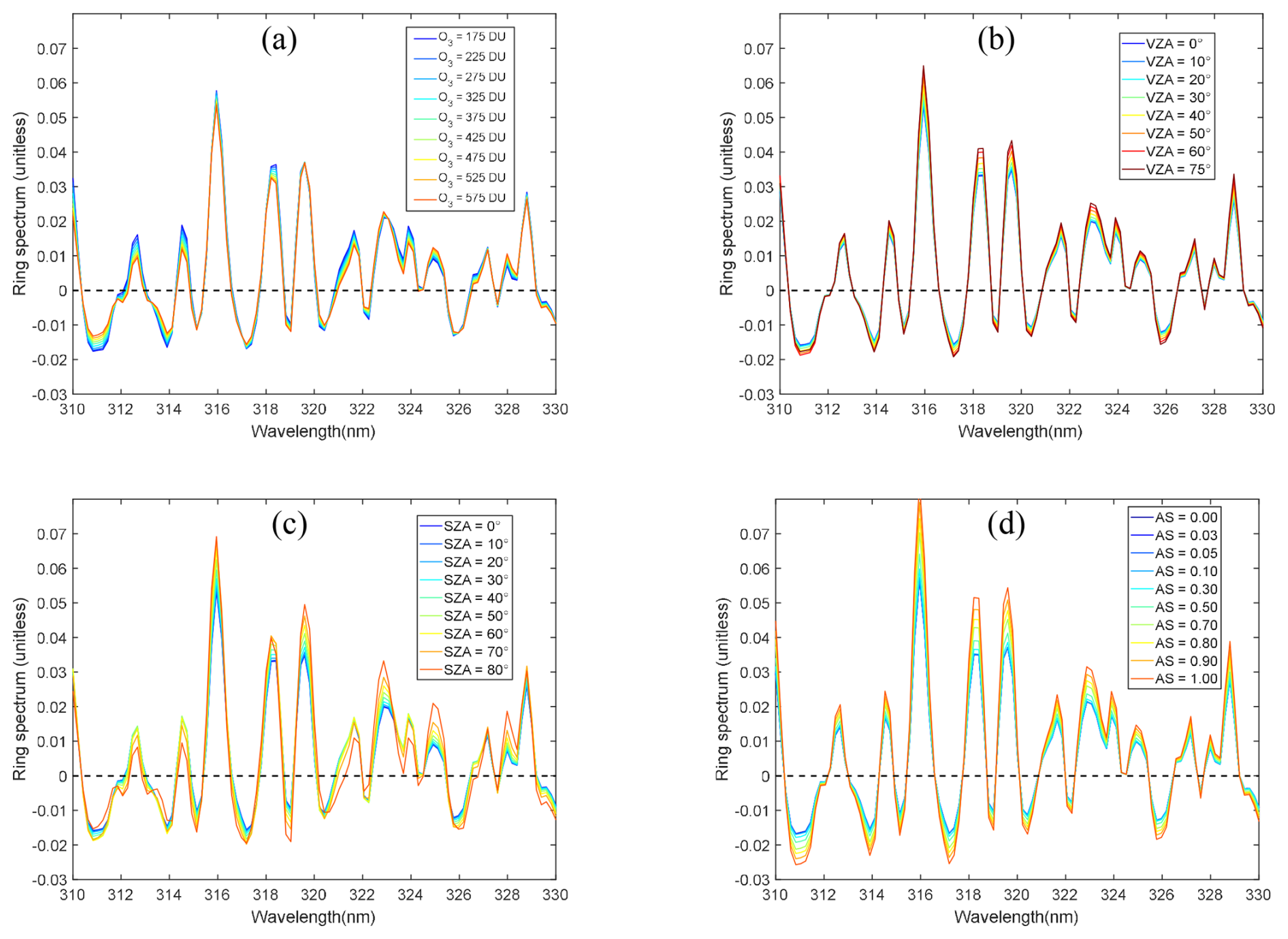 In the UV wavelength band, the Ring effect is a non-negligible part of the DOAS SCD fitting process. Taking the OMS 20240823_1036 orbit as an example, after including the Ring spectrum into the DOAS retrieval, the spectral fitting RMSE decreases by approximately 0.004 to 0.01. As shown in Fig. 17, the Ring spectrum varies with SZA, VZA, O3 column and AS within the 310–330 nm wavelength range. The variation of the Ring spectrum with RAA is negligible and is therefore not presented. The mean percentage change in the Ring spectrum is approximately 27.67 % (absolute deviation: 0.0025) as the O3 column varies from 175 to 575 DU, 47.34 % (absolute deviation: 0.0048) as the AS varies from 0 to 1, 24.18 % (absolute deviation: 0.0021) as the VZA varies from 0 to 75°, and 45.29 % (absolute deviation: 0.0047) as the SZA varies from 0 to 80°.