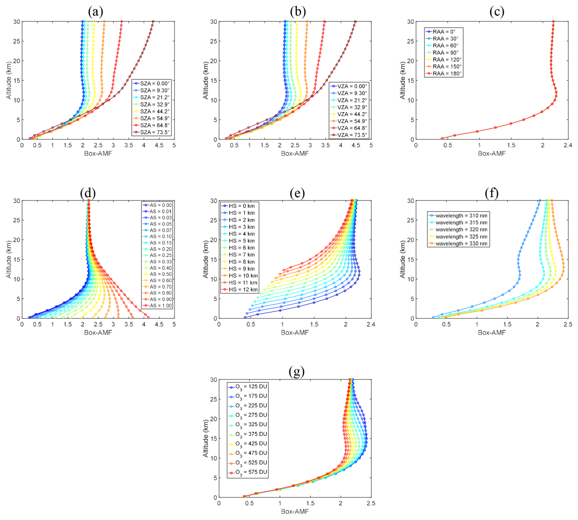 Where ci represents the SO2 number density in the ith layer, and Δhi denotes the thickness of that layer. Box-AMFs quantify the contribution of each atmospheric layer to the total AMF and allows for flexible updates of AMF with new SO2 profiles, eliminating the procedure of rebuilding the AMF lookup table (LUT).