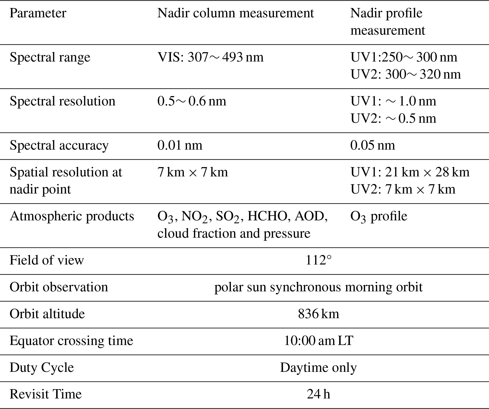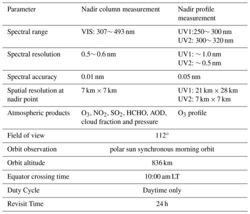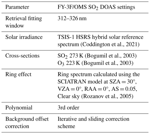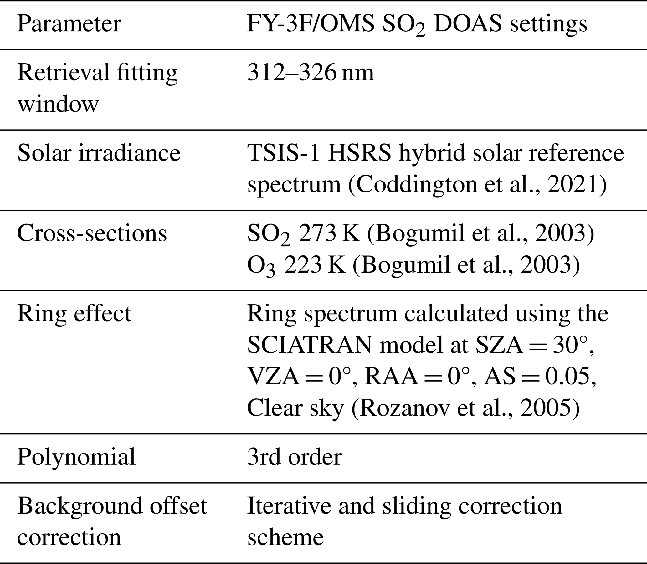 The Ozone Monitoring Suite (OMS) onboard FY-3F satellite is a new instrument in the FY-3 family of satellites. It has two observation modes: Nadir (OMS-N) and Limb (OMS-L) (Wang et al., 2024). While OMS-L provides information on the vertical distribution of O3, OMS-N is mainly used to obtain column information on trace gases such as O3, NO2, SO2, and HCHO, and aerosols, as well as vertical profiles of O3. OMS-N operates using a push-broom observation technique to obtain daily global measurements, with a wide Field of View (FOV) of 112°. It incorporates two imaging grating spectrometers covering the UV (250–320 nm) and VIS (307–493 nm) bands, where the UV measurements are divided into the UV1 (250–300 nm) and UV2 (300–320 nm) sub-bands. Each spectrometer uses a 1024 × 1024 pixel imaging array, with one dimension recording spatial information along the slit and the other recording spectral information. To enhance the signal-to-noise ratio (SNR) of the original detector rows, OMS L1 applied an onboard spatial binning strategy: sets of 16 pixels were averaged to yield 58 cross-track spatial rows in the UV1 band, and 4 pixels were averaged to produce 238 cross-track spatial rows in the UV2 and VIS bands, respectively (Wang et al., 2024). The remaining spatial rows were reserved for calibration purposes. The OMS-N VIS band (307–493 nm) was used for the retrieval of OMS SO2 columns in this study. It has a high spatial resolution of 7 km × 7 km at the nadir point, with a spectral resolution of 0.5–0.6 nm (Table 1). FY-3F/OMS data can be downloaded from the website http://data.nsmc.org.cn/DataPortal/en/home/index.html (last access: 10 March 2026).