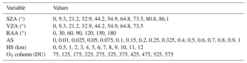 To improve computational efficiency, a cloud-free Box-AMF LUT was built using SCIATRAN, considering six variables: SZA, VZA, RAA, AS, HS, and O3 column. The detailed values for each variable are listed in Table 3. Although Box-AMFs are wavelength-dependent, the LUT in this study was calculated at 320 nm, approximately at the center of the OMS SO2 retrieval window (312–326 nm). For each OMS pixel, Box-AMF values were obtained by multi-dimensional interpolation within the LUT according to the corresponding observational geometry (SZA, VZA, and RAA) and atmospheric and surface conditions (AS, HS, and O3). The observational geometry parameters and surface height were directly obtained from the OMS L1 radiance product. The corresponding surface reflectance was interpolated from the OMI surface reflectance climatology (Kleipool et al., 2008). The total ozone column used for LUT interpolation was obtained from the corresponding OMS ozone product (Xu et al., 2025). Due to the current unavailability of synchronized and reliable OMS cloud and aerosol products, the effects of clouds and aerosol on SO2 retrievals were not considered in this study. Consequently, the AMFs for all OMS pixels were calculated using the cloud-free Box-AMF LUT. Section 5.2 of this study provides a detailed description of the AMF error analysis.