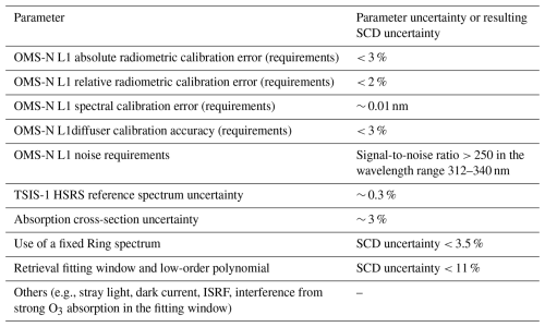 The main error sources affecting OMS SO2 SCD primarily include instrument-related noise and algorithm settings in spectral fitting (Table 4). These error sources are difficult to separate, making it challenging to quantitatively estimate how each individual error source contributes to the SCD retrieval uncertainty. Although OMS L1 provides specified performance requirements before launch, on-orbit measurements indicate that the OMS L1 errors deviate from the planned specifications for certain parameters. At the time of writing, the updated OMS L1 errors have not yet been obtained. Therefore, in this study, we do not report the contribution of each individual error source to the final SCD uncertainty. Instead, we use the DOAS Spectral Fitting Error (SFE) to derive the overall SCD uncertainty under the current OMS L1 instrument status and DOAS settings.