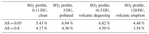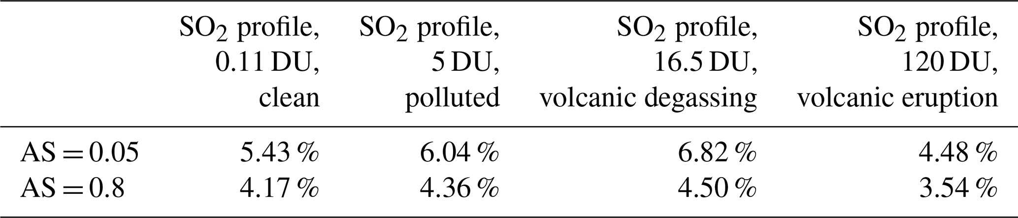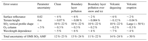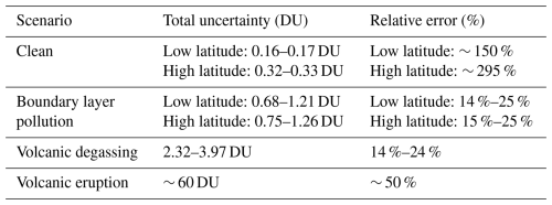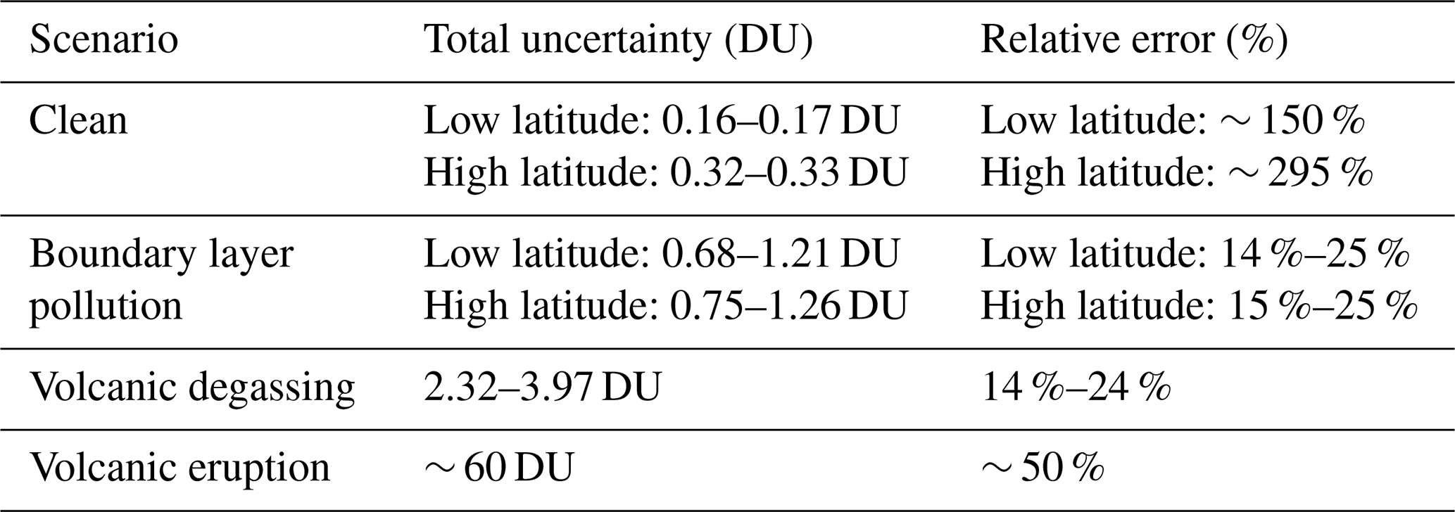 The estimated total uncertainties of OMS SO2 VCDs under four scenarios – clean, boundary layer pollution, volcanic degassing, and volcanic eruption – are summarized in Table 7. The results show that under clean conditions, the total uncertainty is dominated by measurement noise and fitting errors, ranging from 0.16–0.17 DU at low latitudes and 0.32–0.33 DU at high latitudes. The corresponding relative errors are ∼ 150 % at low latitudes and ∼ 295 % at high latitudes, reflecting the challenge of retrieving low SO2 column. For boundary layer pollution scenarios, the enhanced SO2 signal reduces the relative errors to 14 %–25 %, while the total uncertainty increases to 0.68–1.21 DU at low latitudes and 0.75–1.26 DU at high latitudes. For volcanic degassing, the relative errors range from 14 %–24 %, with total uncertainties ranging from 2.32 to 3.97 DU. Under the volcanic eruption scenario, the total uncertainty and relative error are approximately 60 DU and 50 %, respectively. It should be noted that these estimates still involve large uncertainties due to the large errors in radiance measurement and SO2 vertical profile provided by GEOS-CF, particularly under volcanic eruption conditions. In addition, the uncertainties associated with clouds and aerosols were not included in the present error analysis, suggesting that the estimated uncertainties may be conservative.
