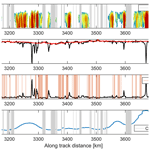 The second panel of Fig. 12 shows the measured NRCS (σ0m), the based on CloudSat method ( CloudSat), and the estimated based on the methodology proposed for EarthCARE ( EarthCARE). Abrupt jumps of up to nearly 1 dB are observed in the CloudSat- and EarthCARE-derived , particularly at transition points between the two estimation methods. Discontinuities in the CloudSat-derived are highlighted with red circles, while jumps observed in both CloudSat and EarthCARE estimates are indicated with black circles in the second panel of Fig. 12. The variable “Diagnostic_PIA_method” in the CloudSat 2C-PRECIP-COLUMN product indicates the estimation method used for each profile, represented by shading in the second panel of Fig. 12. Blue shading denotes the interpolation-based method, while gray shading corresponds to the Wind/SST method.