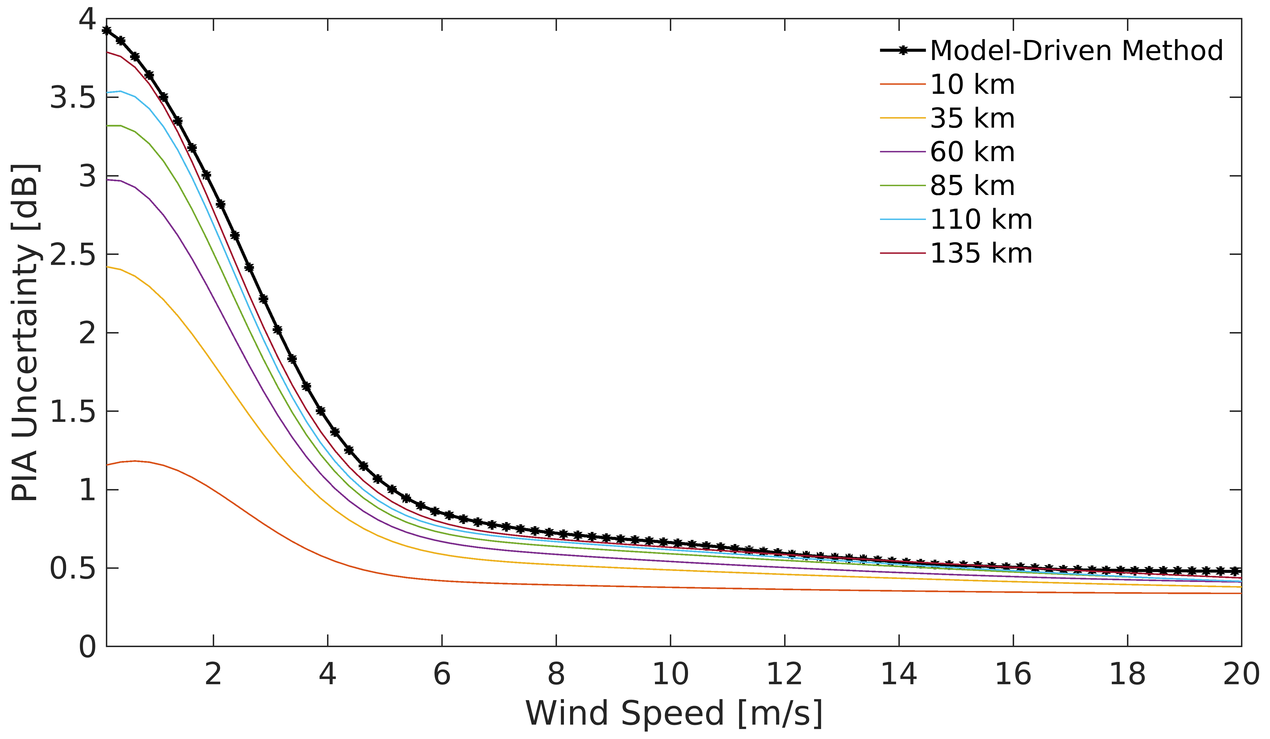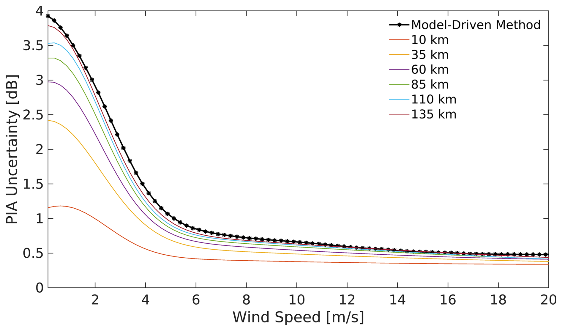 As an alternative to the clear-sky interpolation method, PIA can be estimated directly using Eq. (5), where σ0e is derived from a geophysical model or from a climatology-based derived lookup table that estimates σ0e as a function of wind speed and SST. This approach is referred to as the model-driven method or Wind/SST method.
