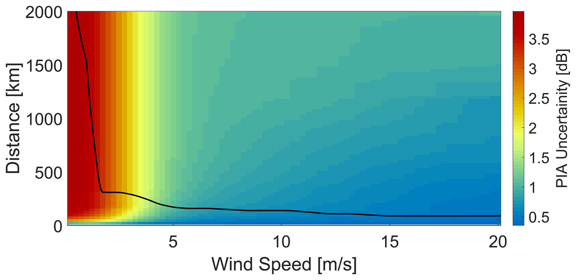 Figure 2Lookup table of two-way PIA uncertainty associated with the clear-sky interpolation method, shown as a function of wind speed at the cloudy profile and distance to the calibration points. The uncertainty is derived using an ensemble of clear-sky oceanic profiles over the June 2024–June 2025 period. For each profile location x, the NRCS is estimated using all other clear-sky profiles as calibration points. The difference between the estimated and measured NRCS at x defines the residual. These residuals are then binned by wind speed and distance to the calibration points, and the uncertainty in each bin is quantified as the standard deviation of the residuals as in Eq. (9). The solid black contour delineates the transition boundary beyond which the model-driven method, Eq. (5), yields lower PIA uncertainty compared to the clear-sky interpolation approach.