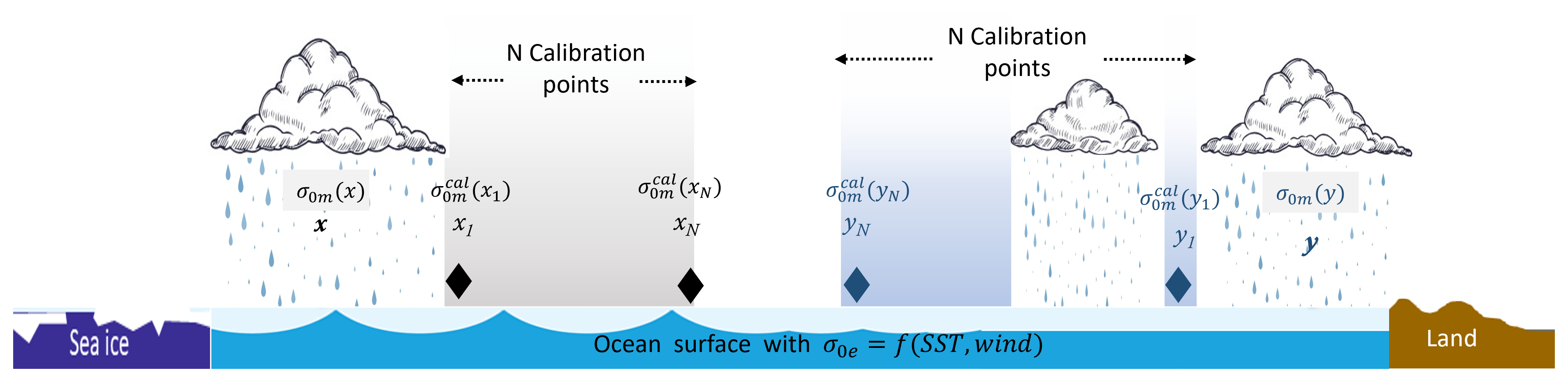 where in both Eqs. (5) and (6) and (respectively) represent two ways to estimate the NRCS that would be measured at x in the absence of hydrometeors (but with the presence of gases).