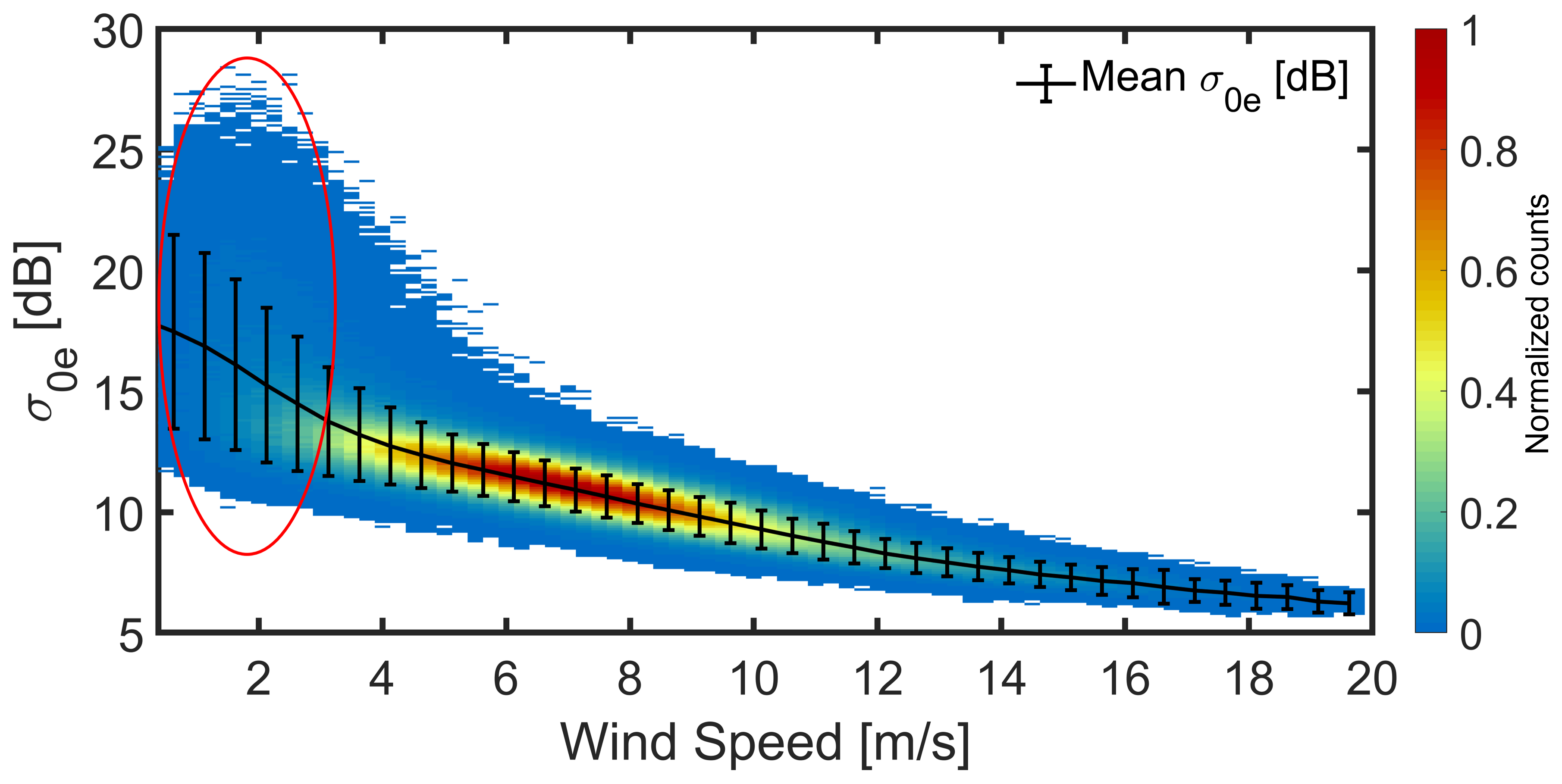 Figure 5Distribution of measured σ0e derived from EarthCARE NRCS observations under clear-sky conditions, corrected for gaseous attenuation, over the period June 2024–June 2025, shown as a function of wind speed. The black curve represents the mean σ0e at each wind speed, with error bars indicating the standard deviation. The red circle highlights the low wind speed regime, where σ0e exhibits greater variability and a higher standard deviation. All counts are normalized to the counts of the pixel with the maximum number of counts.