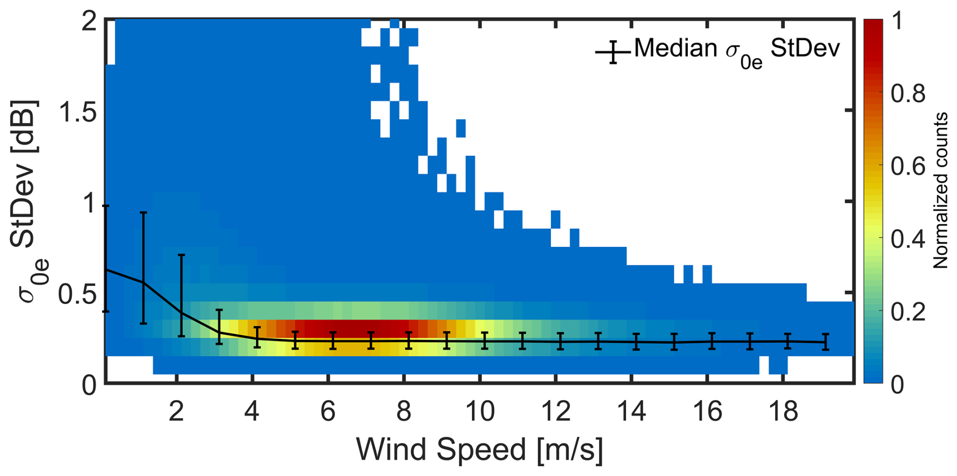 Figure 6Variability of measured σ0e from EarthCARE over the period June 2024-June 2025, expressed as the standard deviation within 10 km along-track segments. Only segments containing at least six clear-sky pixels are included. The black curve represents the median of the distribution, and the error bars indicate the 25th and 75th percentiles. All counts are normalized to the counts of the pixel with the maximum number of counts.