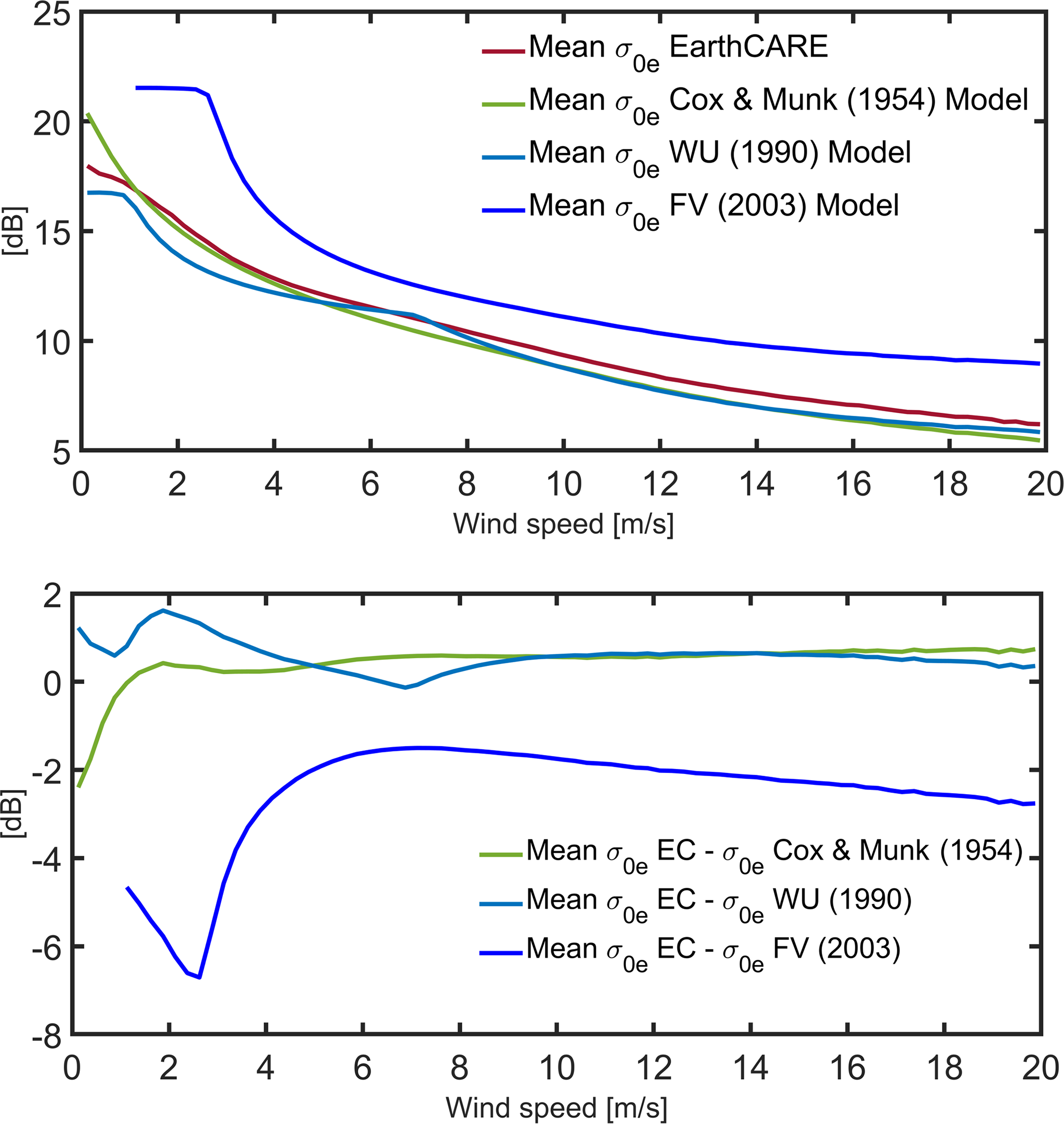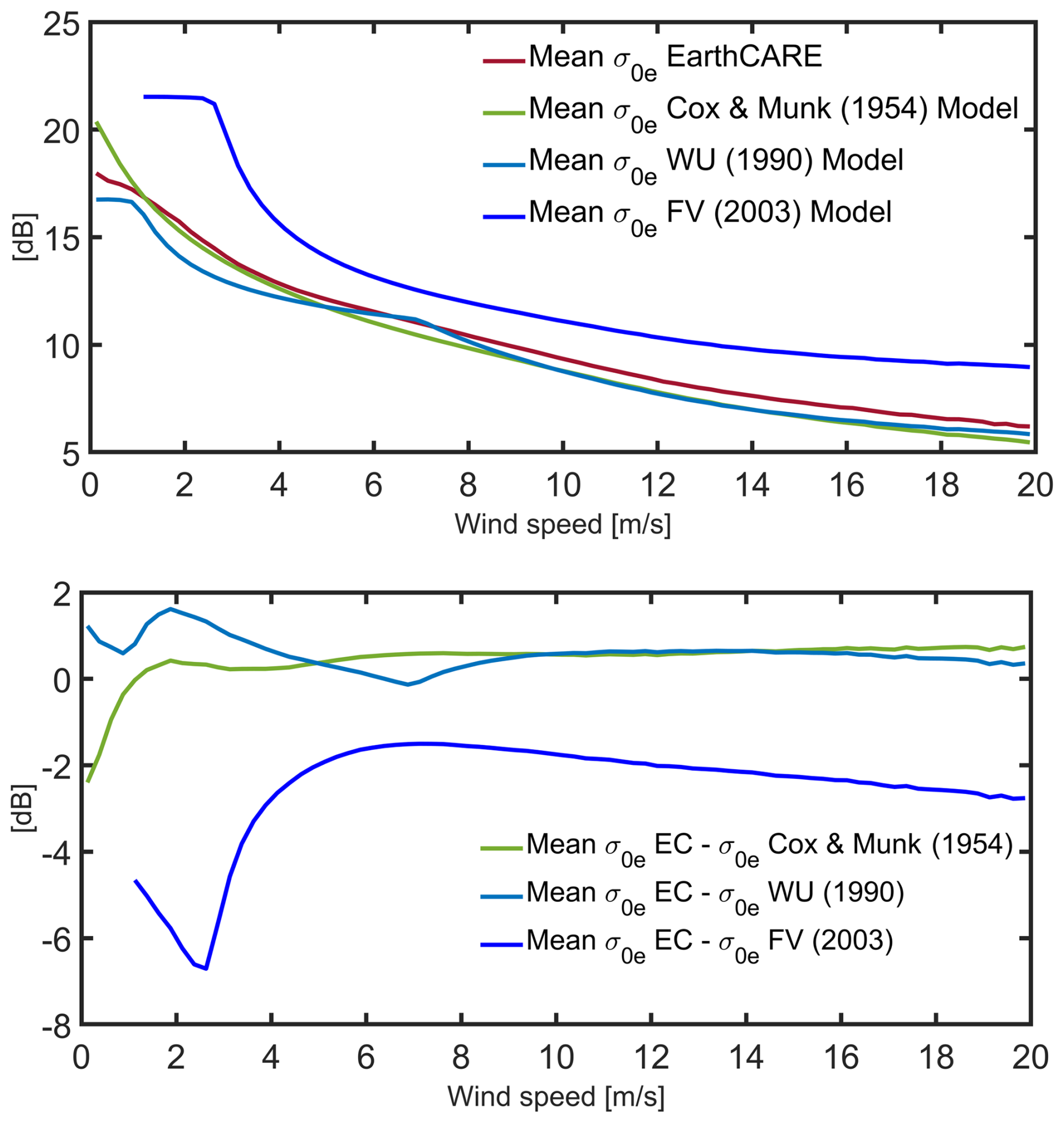 Figure 7Comparison of mean σ0e from EarthCARE with estimates from various geophysical models. The top panel shows the mean σ0e measured by EarthCARE across wind speed bins, alongside the corresponding mean σ0e values from different geophysical models. The bottom panel displays the differences between the EarthCARE measurements and each model estimate.