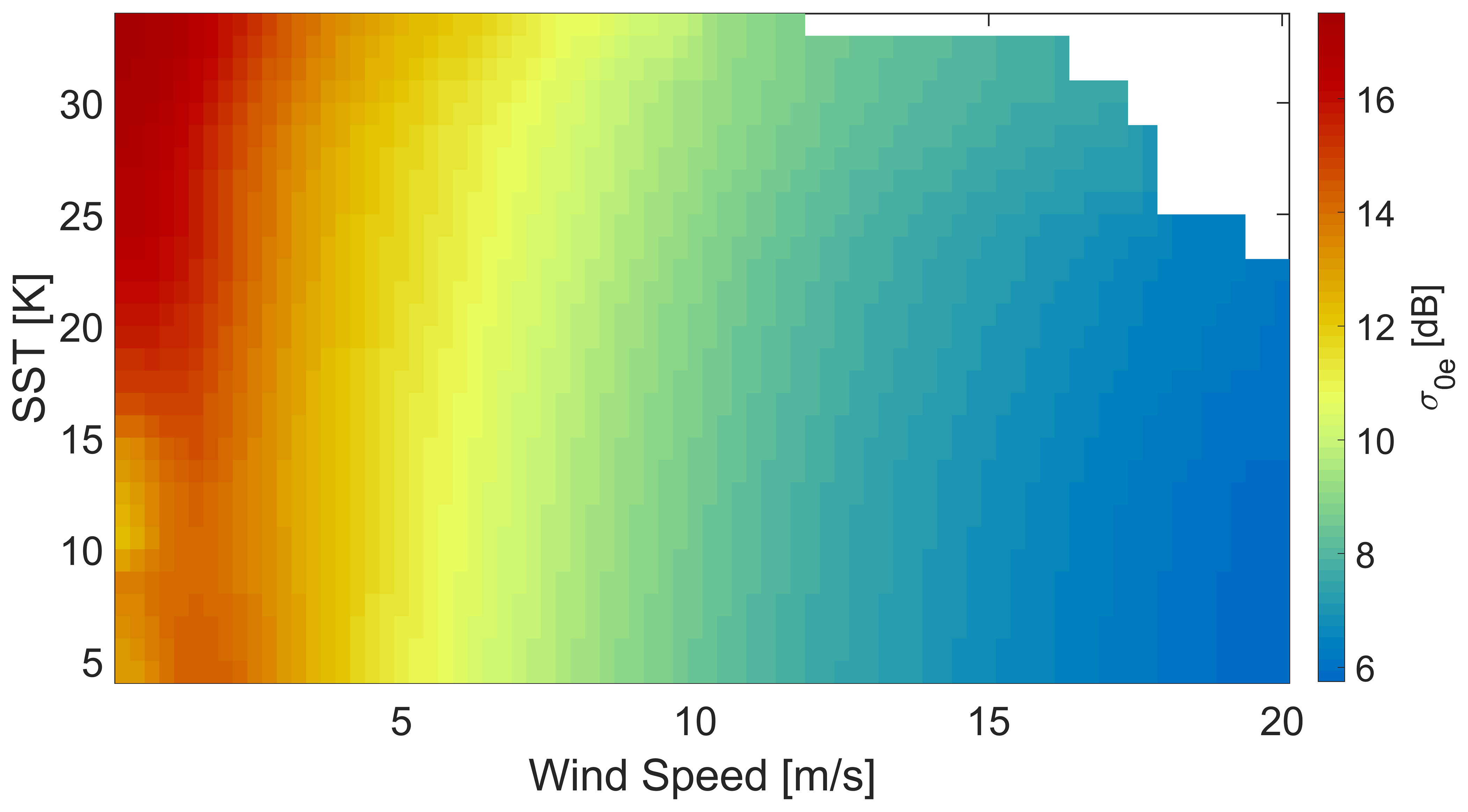 Figure 8Look-up table of the effective surface backscattering cross section (σ0e) derived from EarthCARE measurements collected between June 2024 and June 2025, shown as a function of sea surface temperature (SST) and wind speed. The table is constructed by averaging clear-sky NRCS observations corrected for gaseous attenuation within discrete SST and wind speed bins. Results indicate that σ0e exhibits significantly greater variability with respect to wind speed than SST.
