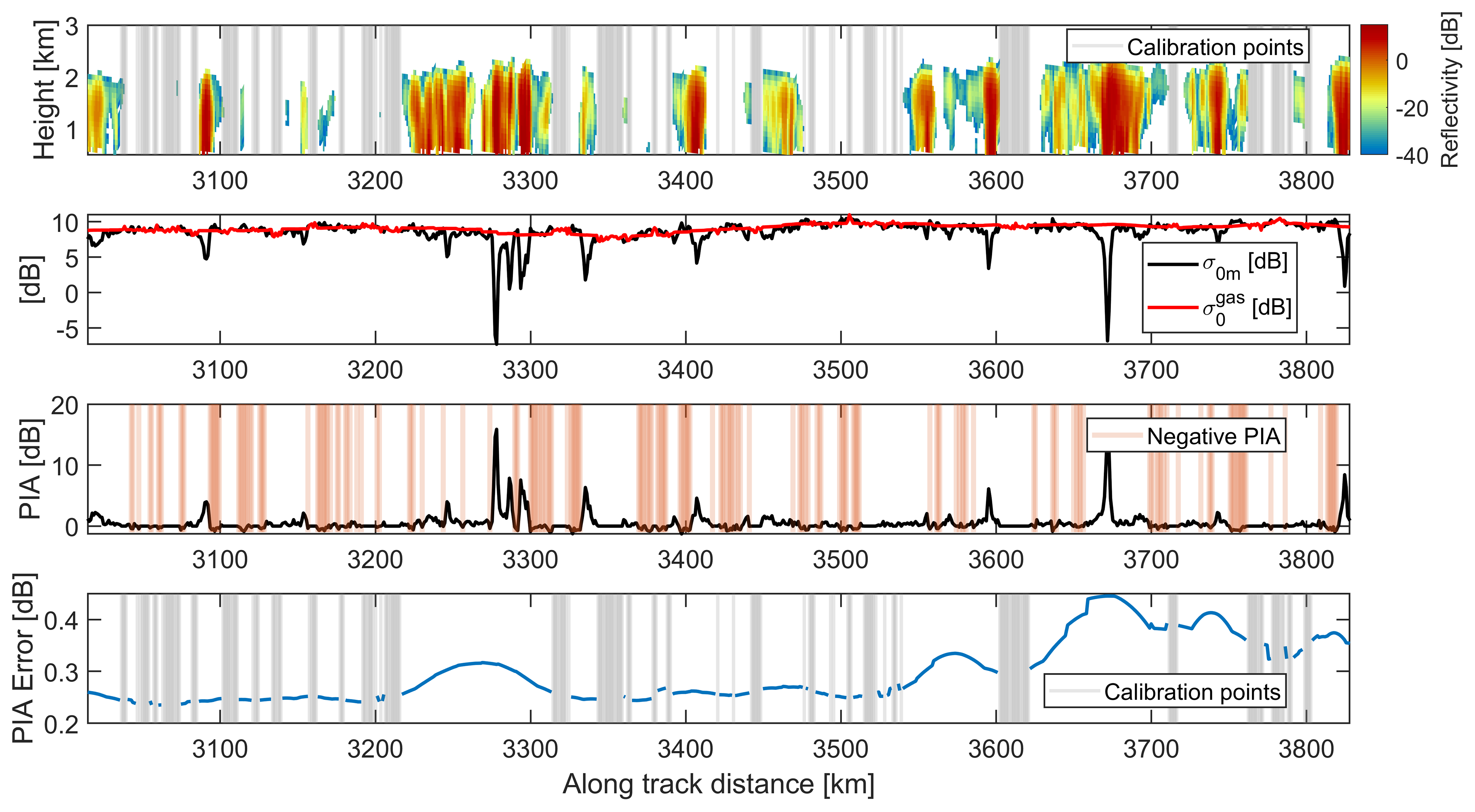 Figure 12 presents a case study from 2 January 2008, using the CloudSat observations. The PIA estimation methodology proposed in this study is also applied to this case for direct comparison with CloudSat method. CloudSat provides estimates of the unfiltered PIA (i.e., without discarding negative values), along with the measured NRCS (σ0m). Therefore, the estimate of NRCS at the cloudy region in the presence of gas only () for the CloudSat products can be obtained by just summing the PIA and the measured σ0m.