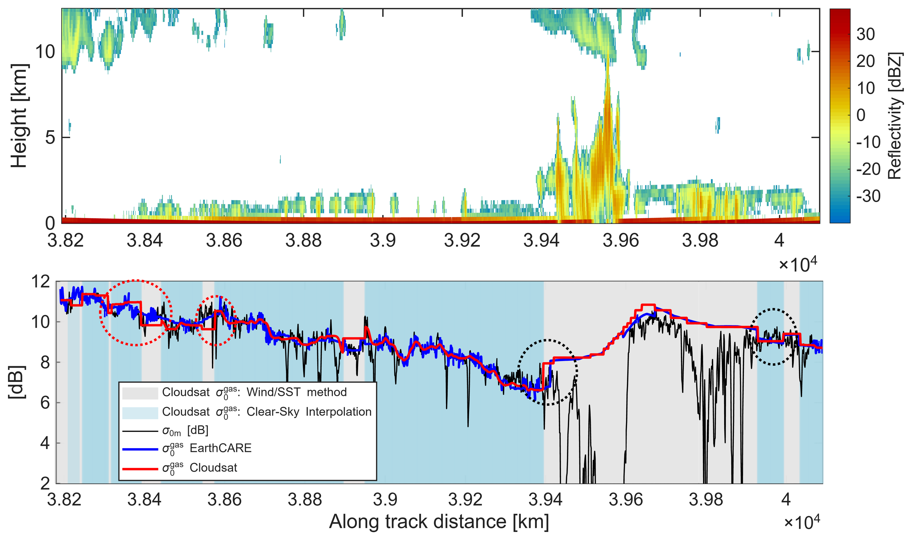Figure 12CloudSat Case Study. Top panel: vertical reflectivity profile as a function of along-track distance. Bottom panel: measured normalized radar cross section (NRCS, σ0m, black curve), along with the estimated clear-sky NRCS () within cloudy regions, derived using the proposed EarthCARE method (blue curve) and the CloudSat-based estimate (red curve). Red circles highlight jumps in the CloudSat estimate, while black circles indicate jumps observed in both EarthCARE and CloudSat estimates. Gray and blue shading in the second panel indicate the two estimation methods used in the CloudSat methodology: the Wind/SST method, which utilizes a geophysical model, and the clear-sky interpolation method. Jumps in the CloudSat generally occur when the method switches between these two approaches.