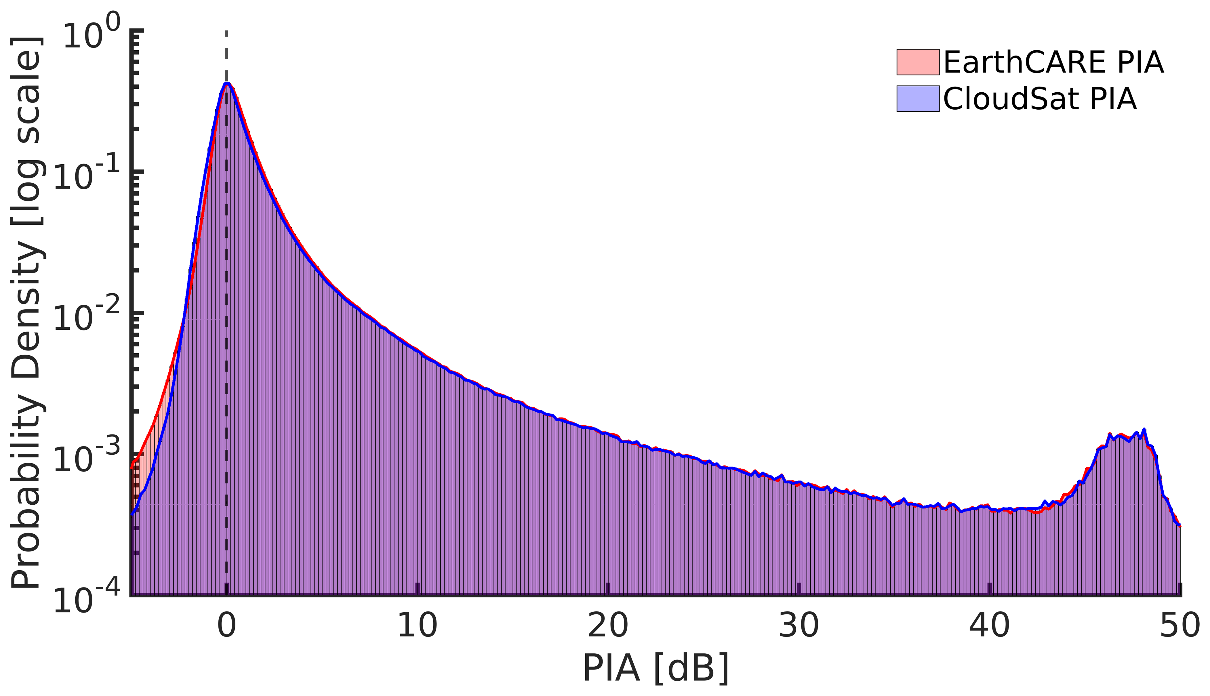 Figure 13The global probability distributions of PIA estimates obtained from the EarthCARE retrieval methodology applied to CloudSat observations (January–April 2007) and from the PIA from CloudSat retrievals are compared on a logarithmic scale. The overlapping distributions demonstrate strong consistency in the statistical characteristics of the two retrieval approaches, supporting the robustness of the EarthCARE method when applied to CloudSat data.