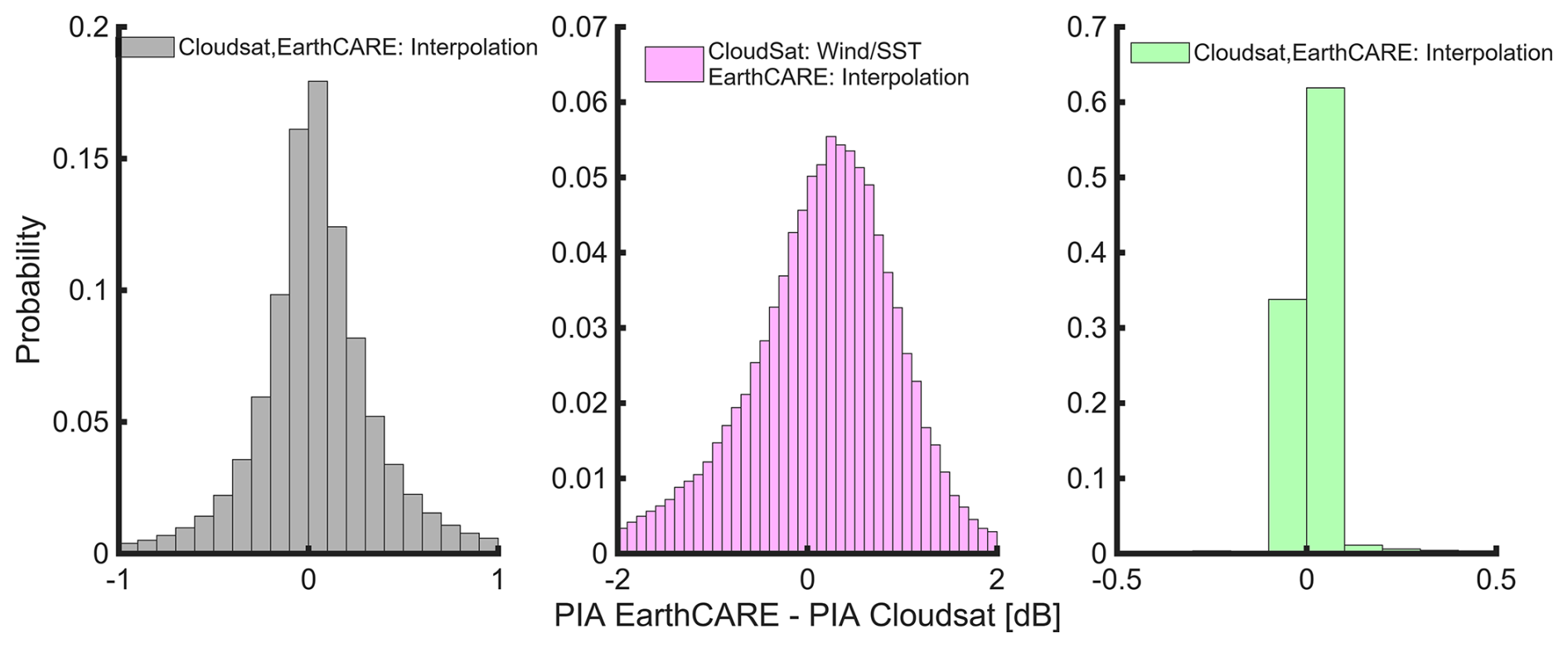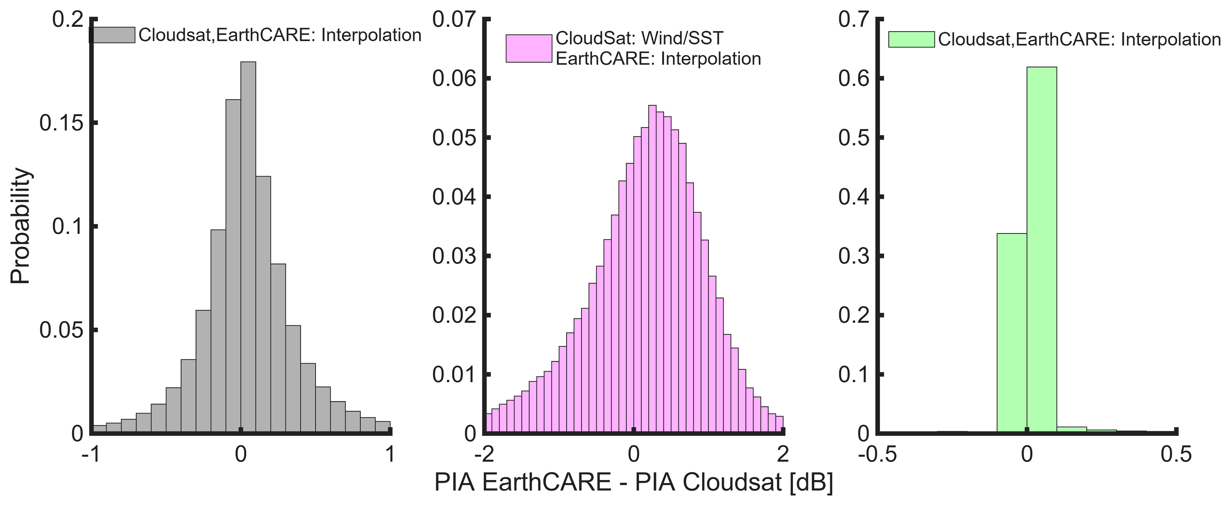 Figure 14Probability distributions of the differences between PIA estimates from the EarthCARE and CloudSat methodologies based on four months of profiles identified as cloudy by the 2B-GEOPROF CloudSat product. The gray histogram shows cases where both CloudSat and EarthCARE use the clear-sky interpolation method, with a narrow distribution centered near 0 dB. The purple histogram corresponds to profiles where CloudSat uses the wind/SST method and EarthCARE applies clear-sky interpolation, exhibiting a broader distribution with a peak around 0.3–0.5 dB. The green histogram represents cases where both EarthCARE and CloudSat use the wind/SST method, with a distribution centered at 0 dB.