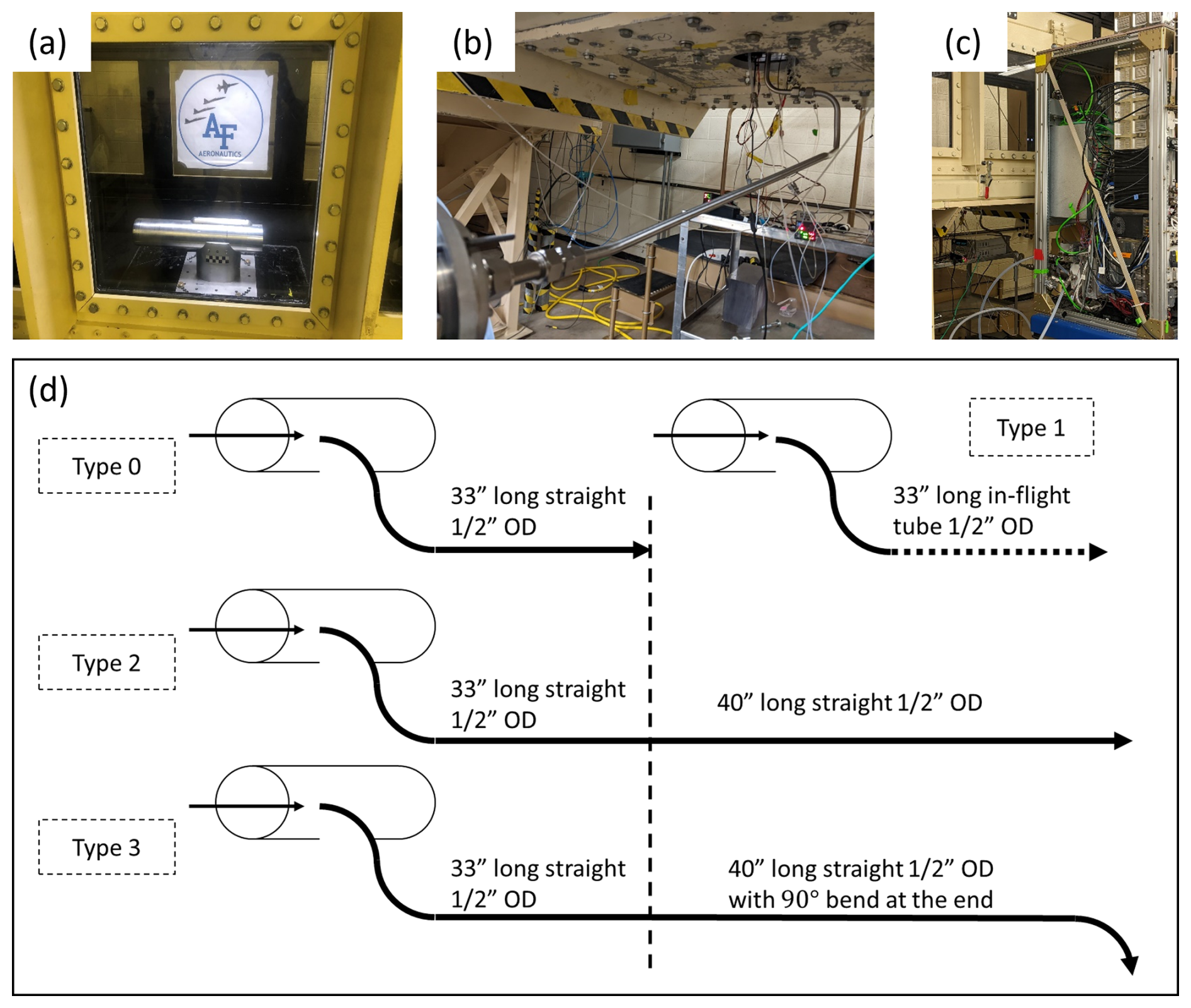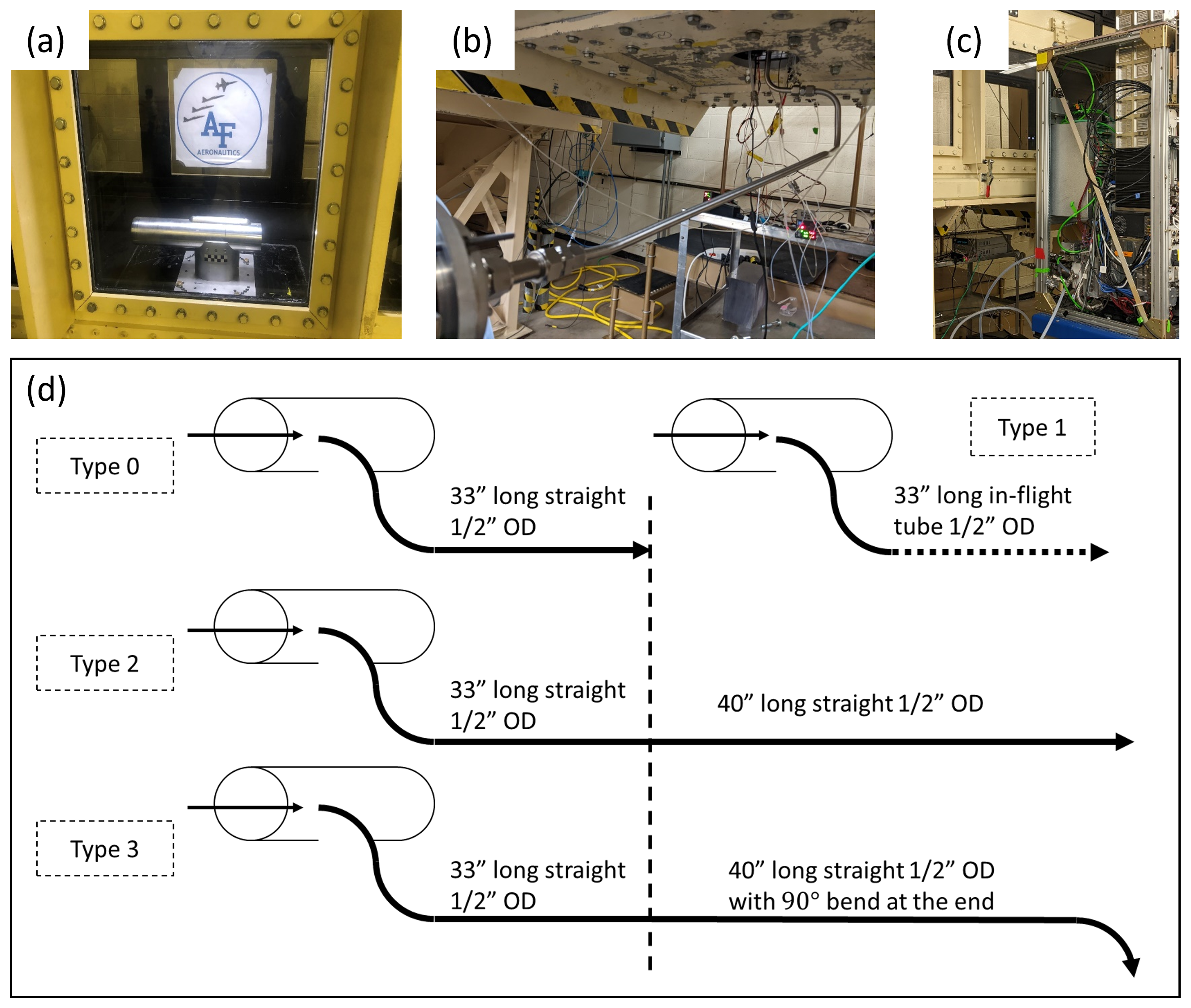 Figure 1The wind tunnel experimental setup for H2SO4 transmission measurements. (a) Laminar gas inlet installed inside the wind tunnel test section. (b) The sampling lines used to connect the inlet with the CIMS instrument (c). The CIMS measured H2SO4 produced from the photolysis of H2O at the tip of sampling tube inside the inlet under different line configurations, and wind tunnel conditions. (d) The schematic of four tested types of sampling lines; the line used in-flight is shown in panel (b) and referred to as type 1. The vertical dashed line marks the first section, which is the same length for each setup. For Type 1, the dashed line represents the different shape, but same length as Type 0.