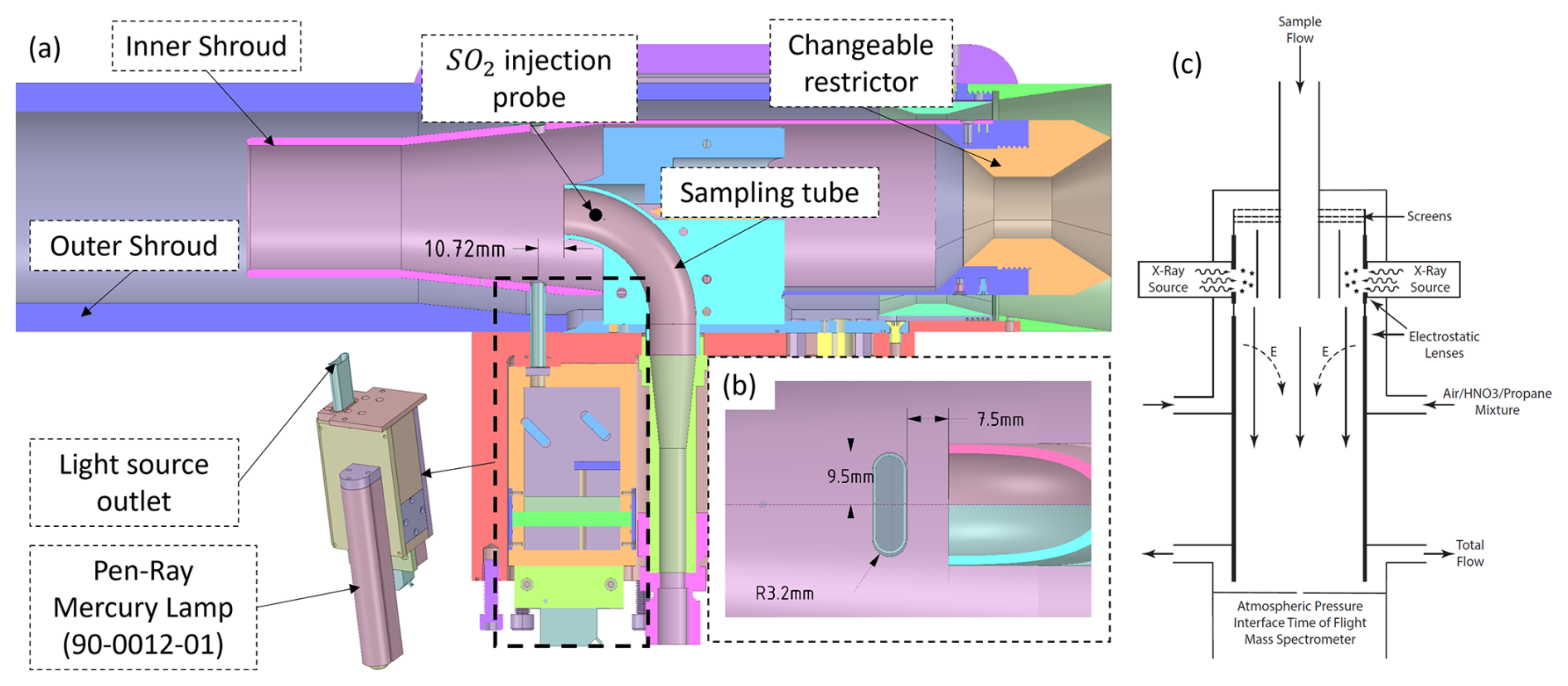 Figure 2Cross-section view of the laminar gas inlet with UV lamp. (a) cross-section side view: shows different components of the inlet, incl. a 3D view of the UV source with mirror housing. (b) Cross-section top view: shows a detail view of the UV source outlet placement in front of the sampling tube entrance with dimensions. (c) CIMS Instrument Diagram.