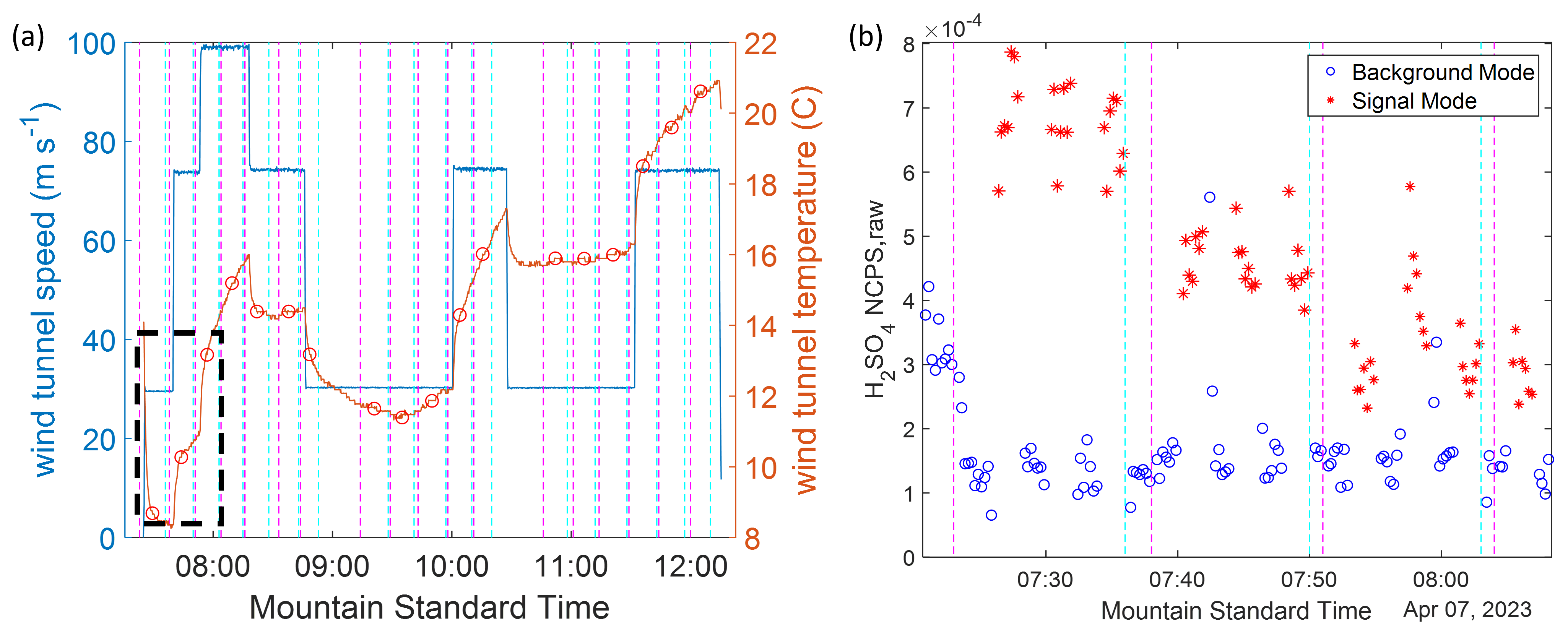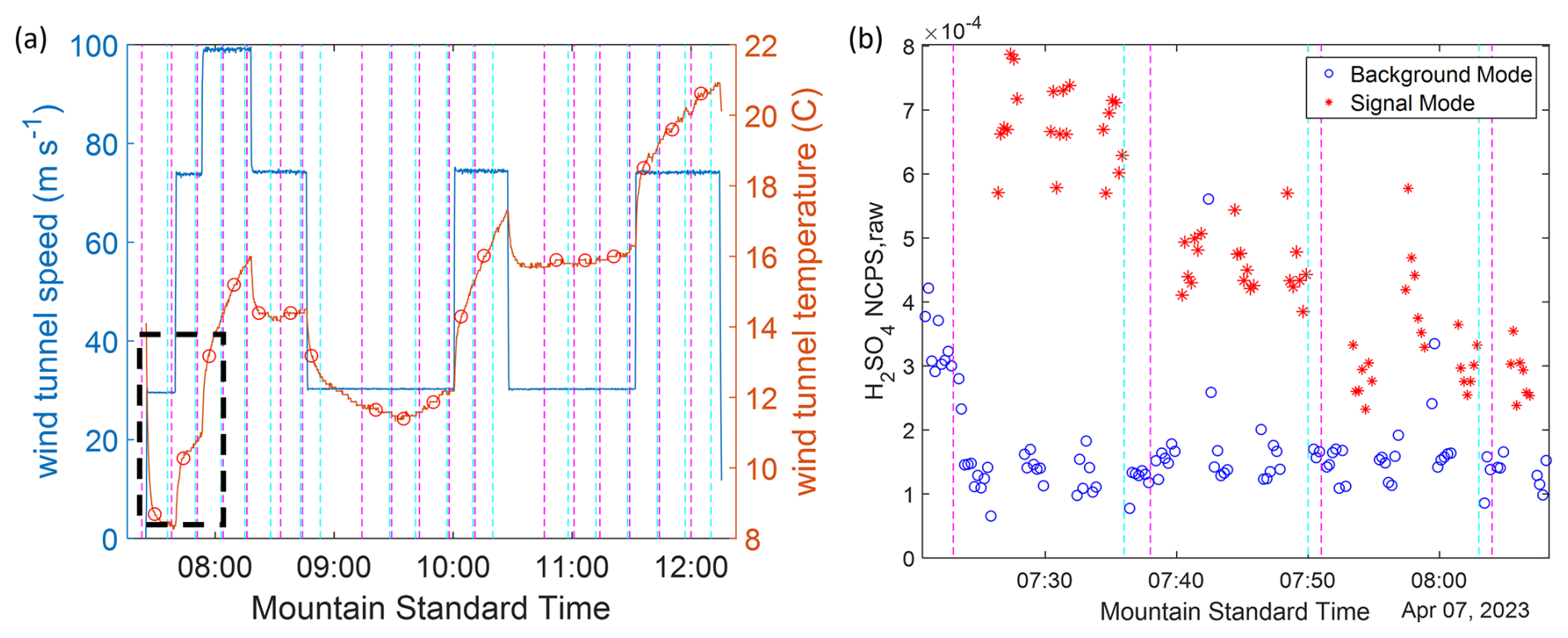 Figure 3Wind tunnel conditions for experiments on 7 April 2023 (a) (blue line) free stream velocity inside the wind tunnel; (red line) temperature inside the wind tunnel, (black circles) averages for the gas measurement periods. (b) Real time H2SO4 NCPS raw measurements for the first three measurement periods marked in panel (a) (blue circles) background mode: detect hydroxyl radical pre-existing in the sample air; (red stars) signal mode: detect hydroxyl radical come from both sample air and water vapor photochemical decomposition. The magenta and cyan dashed lines for both figures mark the beginning and the end of each measurement case, respectively.