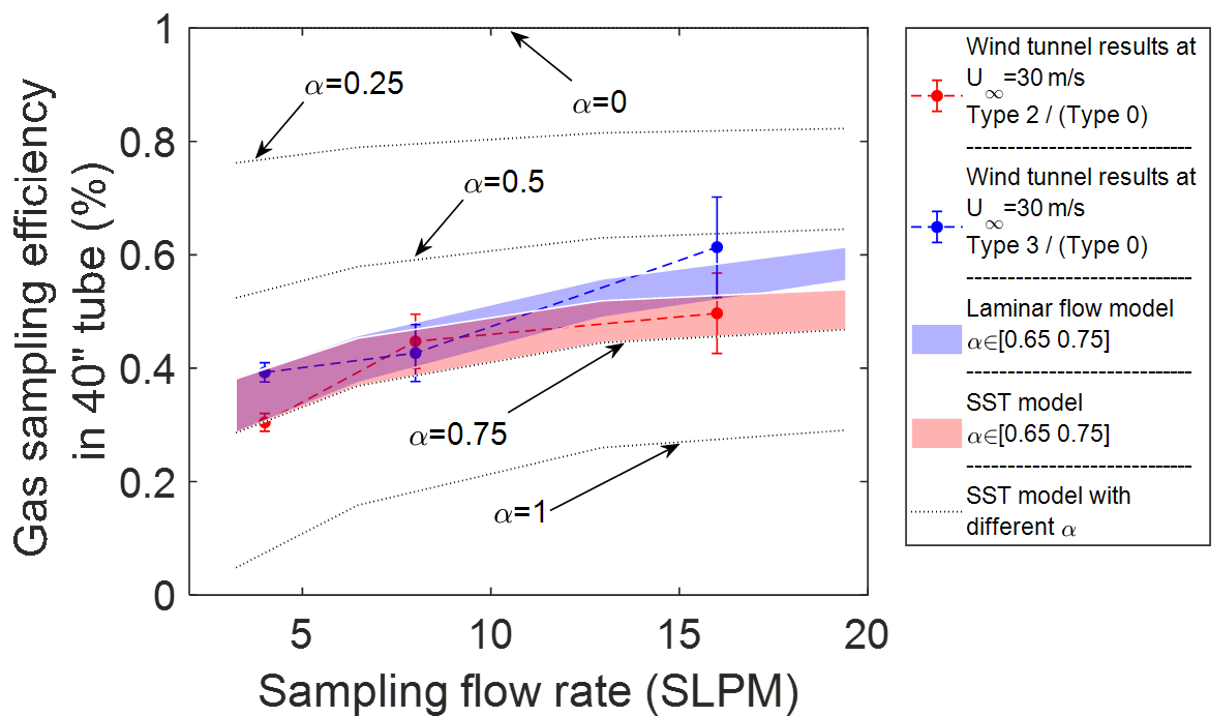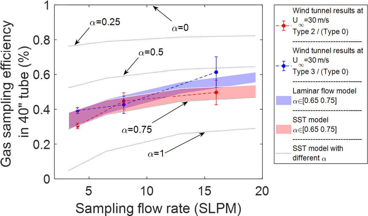 The different sampling conditions are modelled to investigate the factors that influence the gas transmission efficiency. The sampling flow rate and the mass fraction of H2SO4 on the wall are two key factors we investigated. The wall mass fraction boundary condition determines the probability that a gas molecule in the flow is captured on the wall. With a zero mass fraction boundary condition, the wall acts as a perfect sink and every gas molecule is accommodated on the wall. A wall mass fraction of one implies the wall maintains a layer of the gas on it, and the wall effectively does not accommodate any molecules from the flow. Boundary conditions between these two extreme values results in varying ability of the wall to accommodate gas molecules from the flow. Thus, the ratio of species mass fraction on the wall (wwall) to that in the flow (wflow) can be related to an equivalent wall sticking coefficient (αi) for a selected gas species, calculated as: