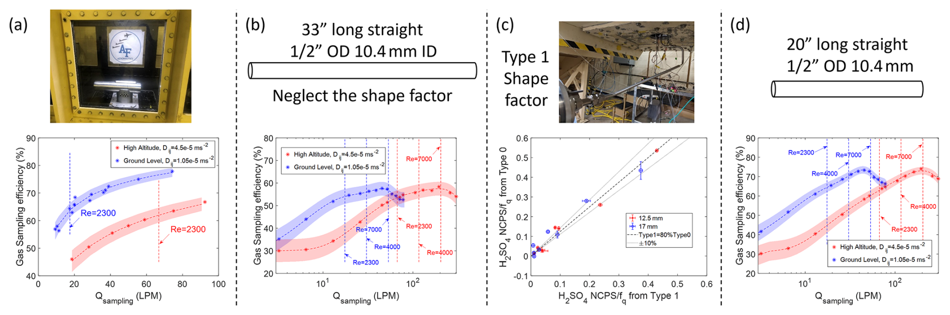 Notably, the individual sampling sections influence the gas-phase H2SO4 transmission efficiency differently. For the aircraft inlet section, the sample flow in the gas inlet is mainly impacted by the upstream turbulence. As a result, the gas sampling efficiency through this section shows a direct correlation with the sampling flow rate, and a difference at the two flight altitudes is mainly due to the laminar diffusivity at high altitude flight condition is set to be ∼ 5 times larger than ground level (Fig. 5a). Similarly, the sample flow in the sampling line is directly impacted by the characteristics of the local flow, the prediction of gas transmission efficiency inside the sampling line is also different between ground level and high altitude (Fig. 5b and d). At ground level, due to the higher flow density, the flow in the sampling tube is reaching the turbulent regime at a lower volume flow rate than at high altitude. In addition, the simulation results from both altitudes consistently show that the gas sampling efficiency can increase even when the sample flow enters the turbulent flow regime (Re > 4000). However, when flow reaches higher turbulent (Re > 7000), the sampling efficiency in sampling tube starts dropping again. This observation is due to the higher prediction of turbulent diffusivity, and indicates that the fate of the overall inlet gas transmission efficiency is determined by the local sampling flow rate (Qsampling). For a selected sampling flow rate Qsampling, increasing the inner diameter of the sampling tube (D) reduces the Reynolds number , and correspondingly the modeled turbulence in the sampling tube, with benefits for the overall gas transmission efficiency. In order to achieve the maximum gas transmission efficiency, our simulation results suggest that the optimized flow rate should maintain the Re in the sampling tube at ∼ 6000.