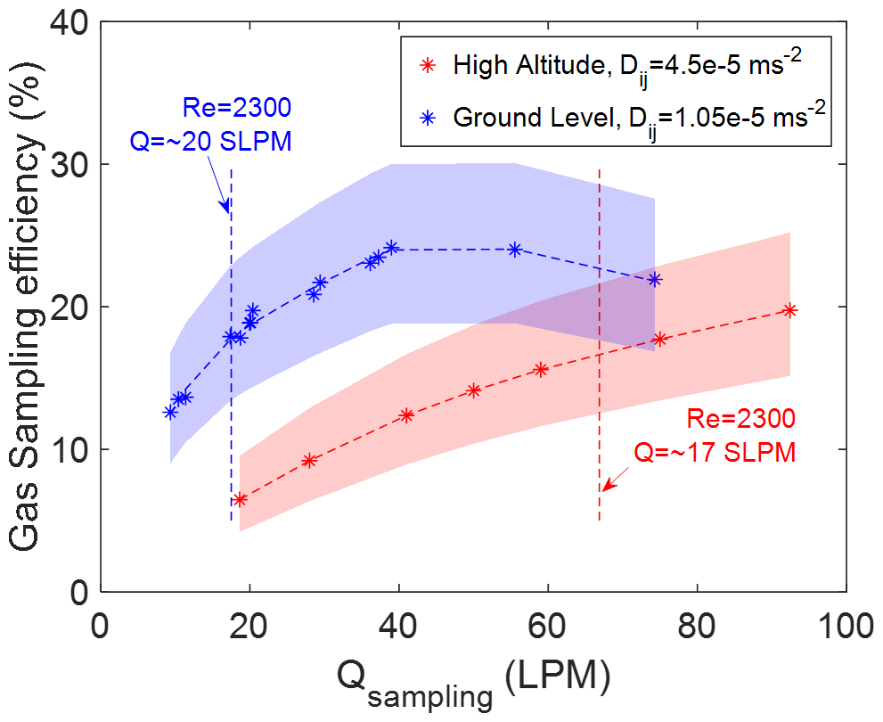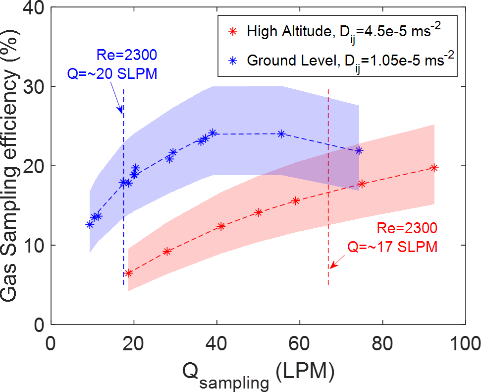 The overall gas sampling efficiency of the actual in-flight sampling system is calculated by multiplying the sampling efficiencies at the different sections and shape factors together. The results are shown in Fig. 6. We present the overall sampling efficiency of the actual in-flight sampling system at two altitudes as a function of the sampling flow rate. The shaded areas in Fig. 6 represent the largest range of uncertainty from ±5 % variation of sticking coefficient and ±10 % variation of shape factor. The simulation results indicate the overall gas sampling efficiency increases with sampling flow rate at both altitudes, and for most sampling conditions. This effect extends even when the sampling flow result in a Reynolds number past the laminar flow regime (Re ≤ 2300). These simulation results suggest that the residence time inside the inlet determines overall inlet transmission even well into the turbulent flow regime. However, the turbulent diffusivity predicted from the flow model increases as the Reynolds number increases. The overall sampling efficiency increases less rapidly, and eventually starts to decrease when the sampling flow rate reaches a much higher Reynolds number level (Re > 7000). The overall sampling efficiency is lower at high altitude compared to ground level if the results are compared at the same flow rate. This is because the laminar diffusivity at high altitude is 5 times more than the value set at ground level. Although the low altitude produces more turbulence and generates higher turbulent diffusivity, the significant change of laminar diffusivity also plays an important role in the sampling efficiency calculation. The simulation results suggest that the overall sampling efficiency of gas-phase H2SO4 for the actual in-flight sampling system can increase by a factor of 2 (from 12 % at 10 SLPM sampling flow rate to ∼ 20 % at ∼ 30 SLPM) by increasing the sampling flow rate at ground level. At high altitude, due to lower operating pressure resulting in a much higher laminar diffusivity, the overall sampling efficiency can increase to ∼ 20 % by increasing the sampling flow rate.