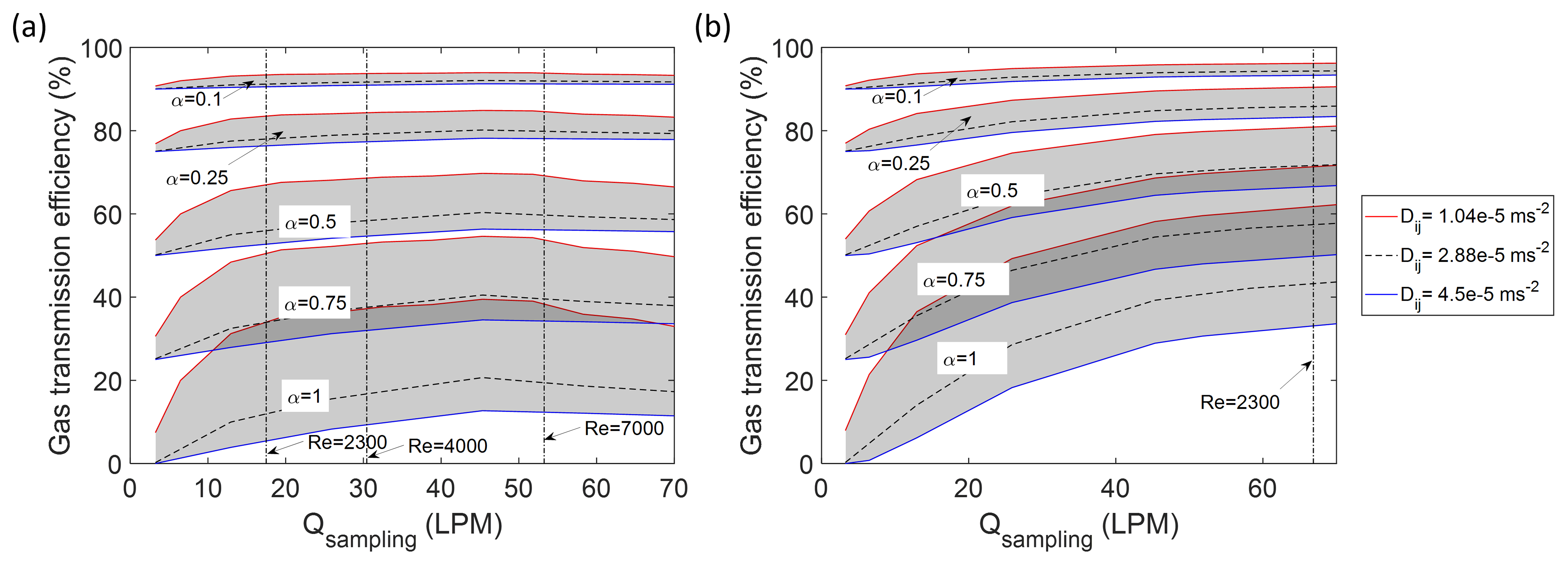 Figure 7The comparisons of gas sampling efficiency between different laminar diffusivities at the sampling line section. (a) The correlation of gas sampling efficiency in 33′′ (0.84 m) straight tube at ground level condition (1013 mbar). (b) The correlation of gas sampling efficiency in 33′′ (0.84 m) straight tube at high altitude condition (220 mbar). The red line shows the sampling efficiency with diffusivity set as 1.04 × 10−5 m2 s−1. The blue line shows the sampling efficiency with diffusivity set as 4.5 × 10−5 m2 s−1. The shade areas covered the predicted sampling efficiency between these diffusivities at a selected sticking coefficient. The dark dash line in the shade areas shows the sampling efficiency with diffusivity set as 2.88 × 10−5 (m2 s−1).