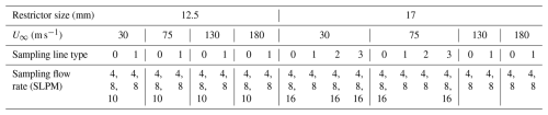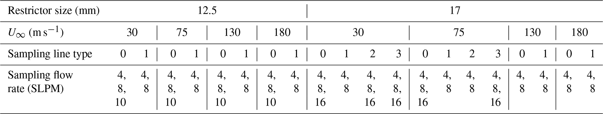In addition, to emulate the different operating conditions and to examine the impact from different system designs, four parameters were varied in the wind tunnel experiments, i.e., restrictor size of the aircraft inlet, free stream velocities (U∞), sampling line type, and sampling flow rate. The testing cases are summarized in Table 1.