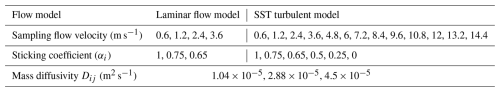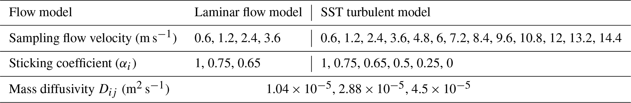 In our simulations, we vary the wall mass fractions to vary the effective wall sticking coefficient. We vary the laminar or molecular diffusivities to represent different species or operating conditions. The entire set of boundary conditions for flow modeling are shown in Table 2. The operating conditions in the sampling line are obtained from aircraft inlet simulations under both ground level and high altitude conditions. All simulations were modelled assuming steady state flow.