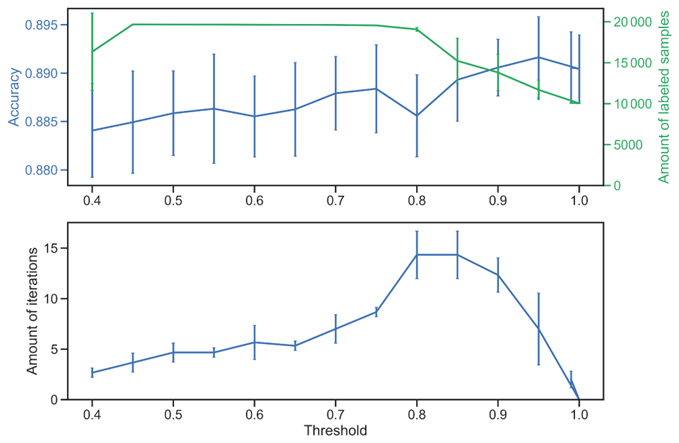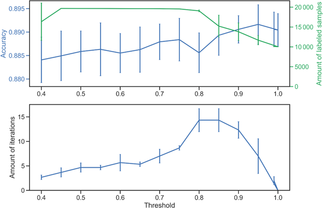 Figure 1Effects of the threshold hyperparameter on the performance and convergence behavior of the Self-Training SVM classifier. Top: cross-validated accuracy (stratified 3-fold) as a function of the threshold (blue line). The right-hand axis (green line) shows the corresponding number of labeled samples used for training at each threshold value, including both the train set and the pseudolabels. Lower thresholds allow more unlabeled samples to be incorporated but can introduce noisier pseudo-labels, while higher thresholds restrict inclusion to the most confidently predicted samples. Bottom: N number of iterations required for the algorithm to complete the self-labeling process across thresholds. At a confidence threshold of 0.95, the framework achieves the highest cross-validation accuracy (89.16 ± 0.42 %) while maintaining conservative pseudo-labeling rates (mean: 1648 ± 1476 samples per fold,  17 % of unlabeled data per fold). Error bars represent one standard deviation across folds.