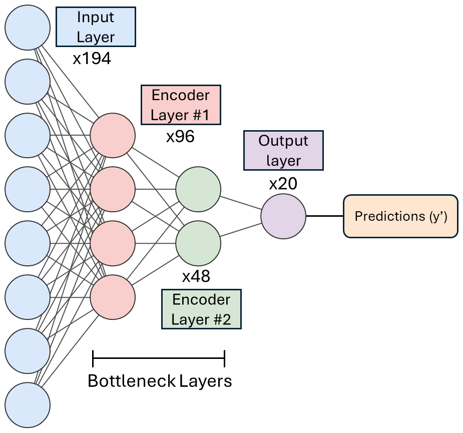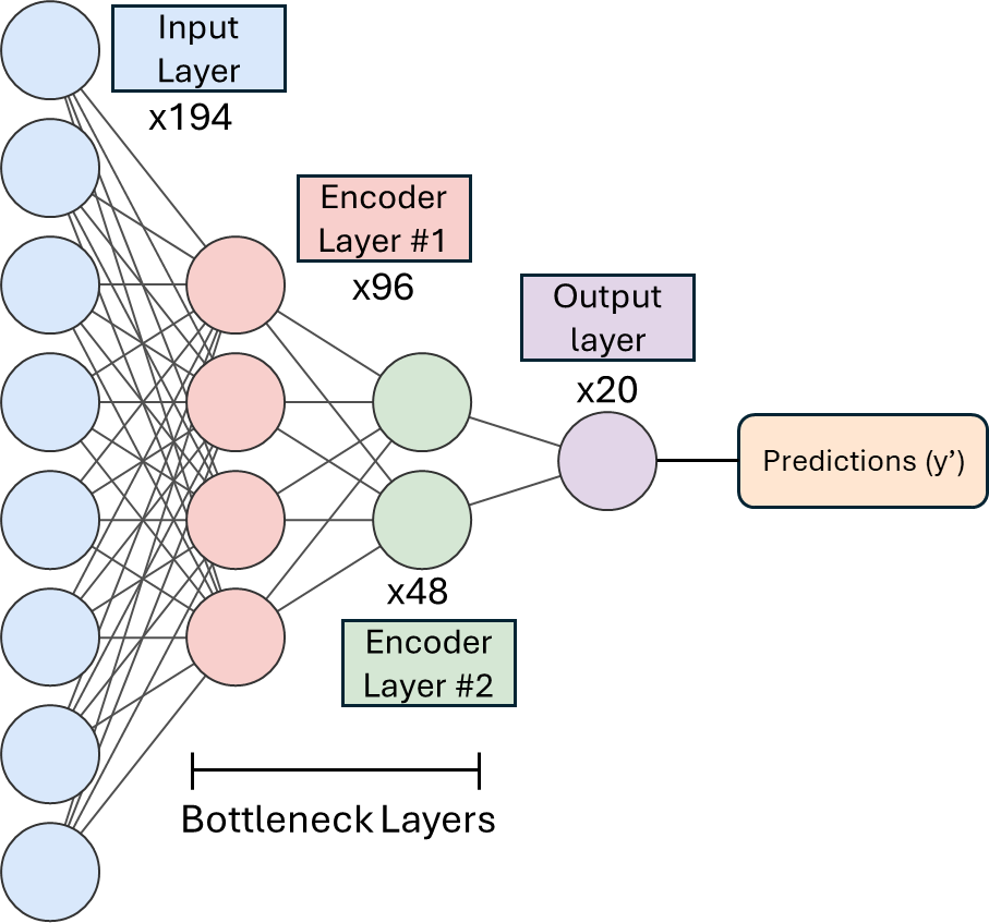 Figure 2Schematic overview of the Stacked Autoencoder Classifier architecture used for single-particle mass spectral classification. The model consists of a series of fully connected layers arranged in an encoder–decoder framework, followed by a supervised classification head. The diagram shows the designated size to each layer. The input layer receives normalized spectral feature vectors (193 m/z intensities plus one aerodynamic diameter feature). These inputs are progressively compressed through two encoder layers. The output layer projects these encoded features into a label space corresponding to the 20 aerosol classes. A softmax activation function converts the raw outputs into class probabilities (y^), enabling probabilistic classification.