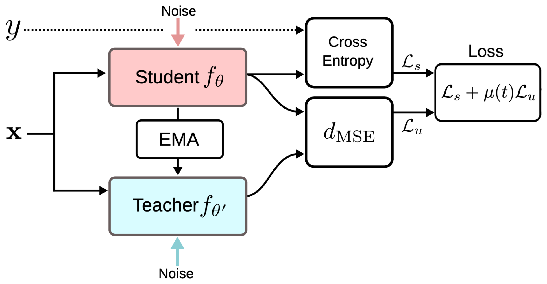 Figure 3Overview of the Mean Teacher framework. (Image source: Tarvaninen and Valpola, 2017). The Mean Teacher architecture consists of two neural networks – the Student model (fθ) and the Teacher model (fθ) – that share the same structure but differ in their parameter updates. For labeled samples (x, y), the Student's predictions are compared against ground truth using a cross-entropy loss (s). For unlabeled samples, the consistency loss (u) is computed as the mean-squared error (dmse) between the Student and Teacher predictions, encouraging the model to produce consistent outputs under input perturbations. The total training objective combines these two components as =s+μ(t)ℒu, where μ(t) is a time-dependent weighting factor that gradually increases the influence of the unsupervised term.